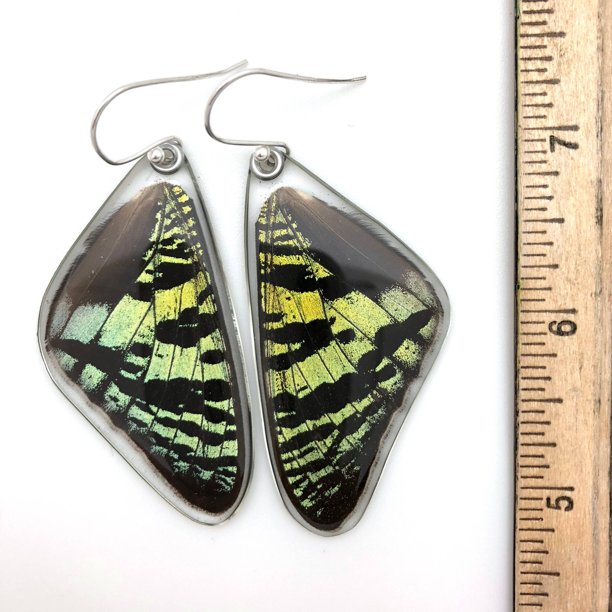 Real butterfly wings pair, whole wing, encased in resin using a proprietary process. Sterling silver earring wire, reversible!