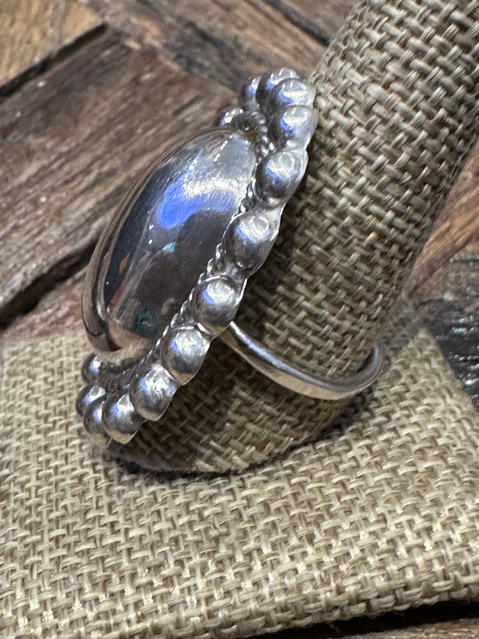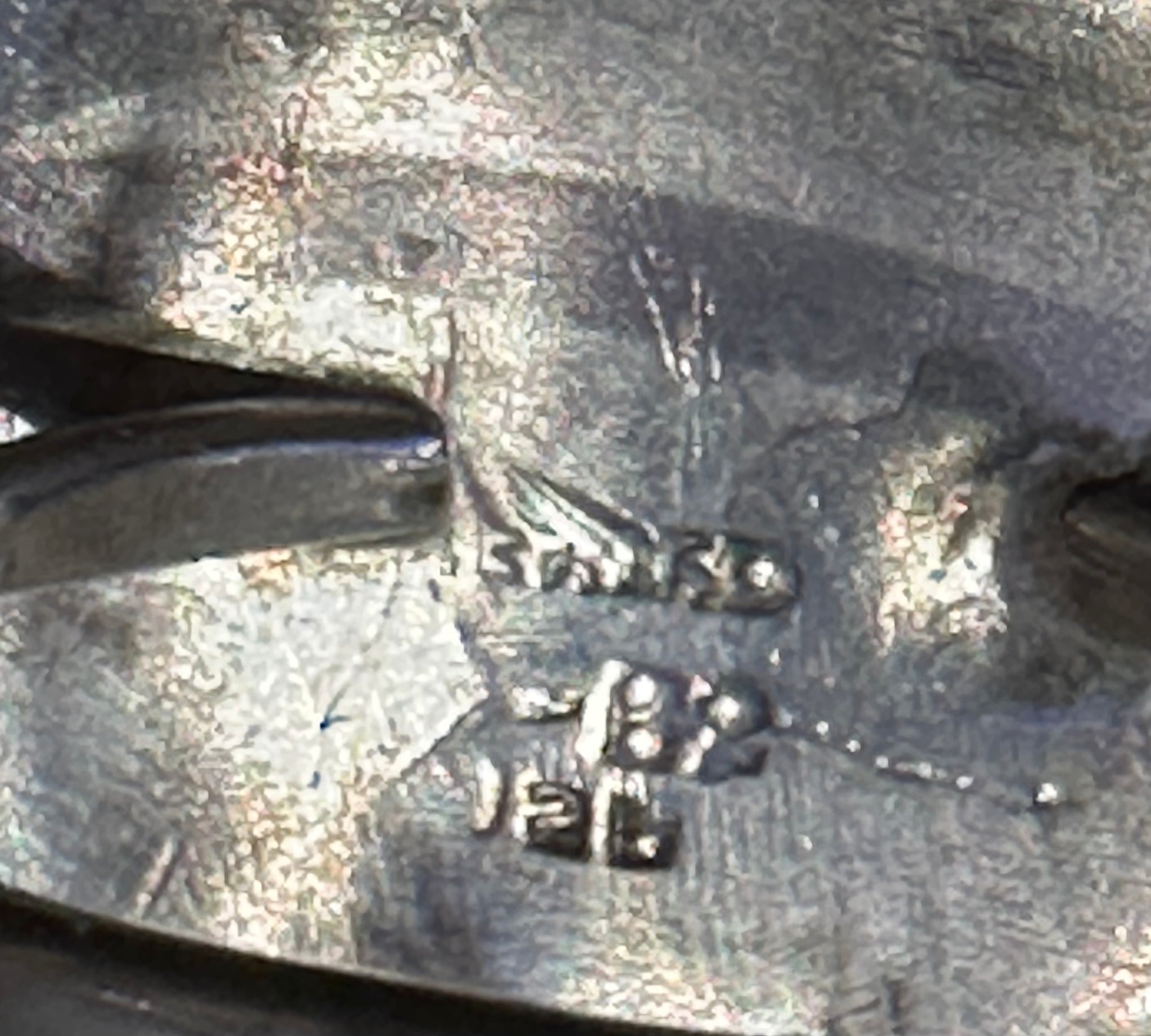 Authentic Old Pawn jewelry will have a natural gray patina, indicating age. It takes decades for the patina to develop and may appear grayer in dry climates like the southwest. Humidity will add a darker, blacker patina. Patina typically isn’t buffed off in order to preserve its history and value. Made of Sterling Silver.