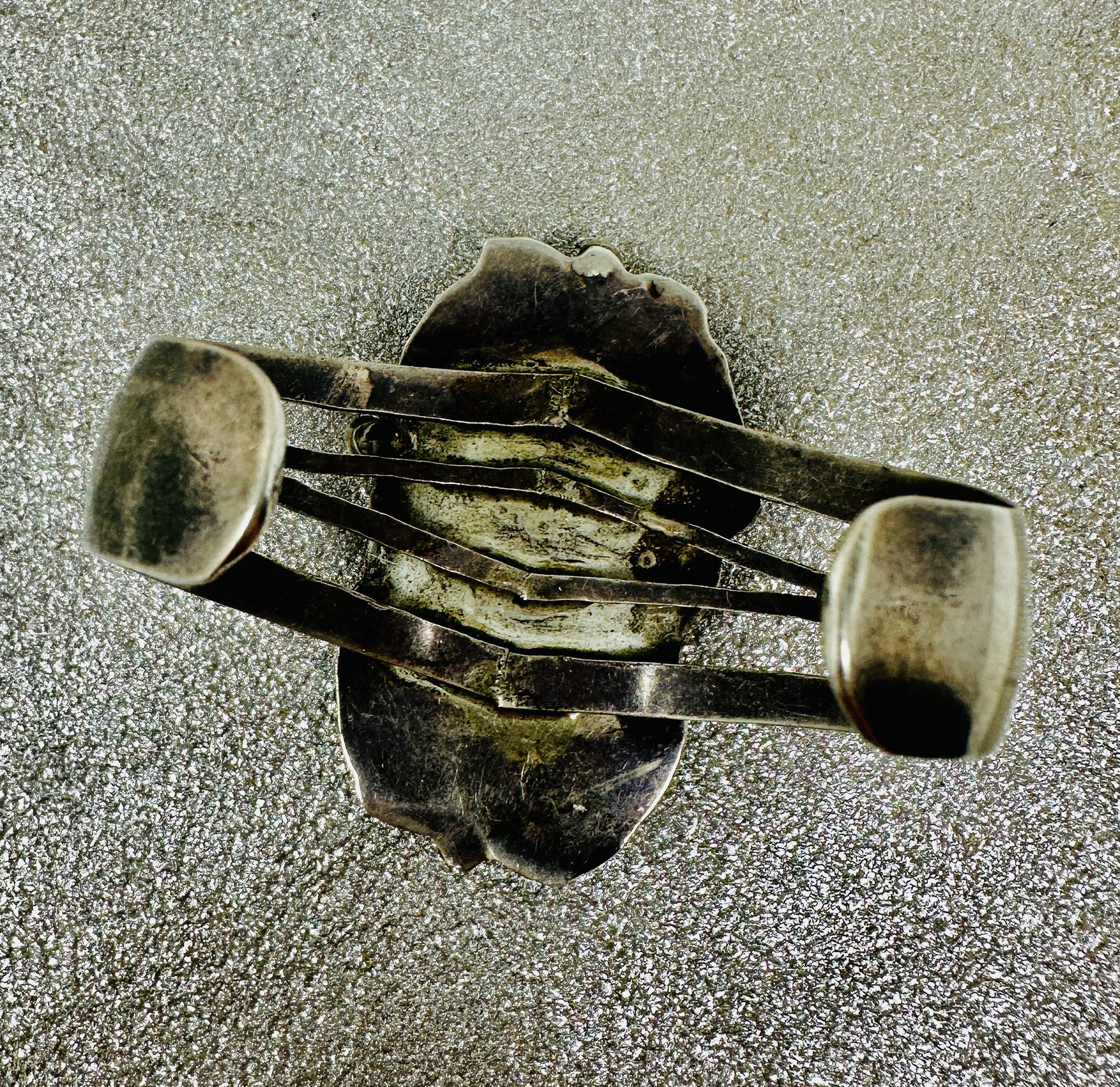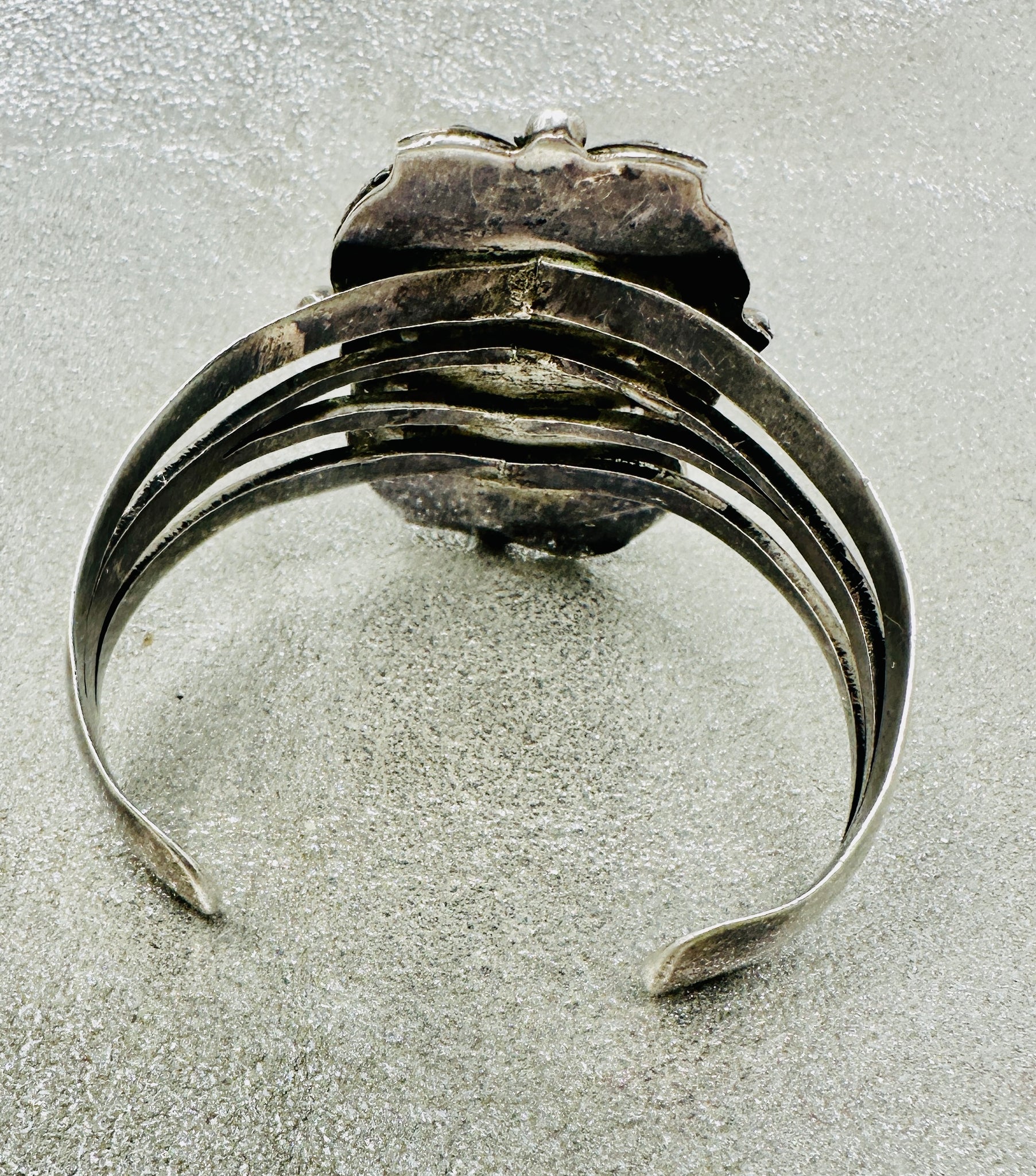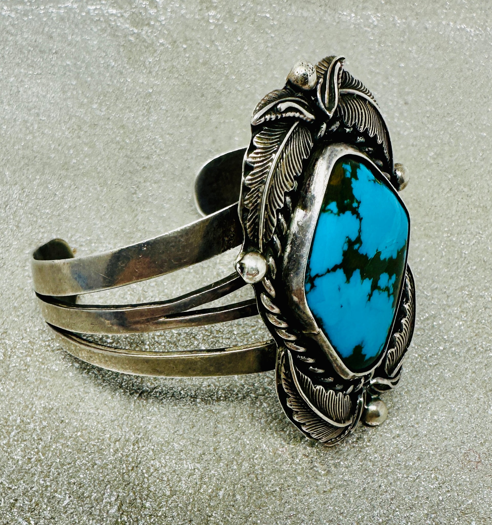 Rare Cuff with Bisbee turquoise stone on a 4 part pulled wire shank. Feather motifs and twisted rope appliquéd. Solid bezel.