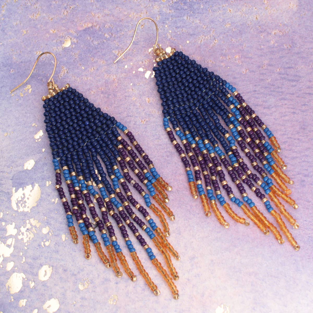 Dive into drama with these dark blue seed bead fringe earrings, accented with luxe purple and shimmering gold beads. They're a dazzling mix of moody glam and playful movement, perfect for turning heads from festival nights to everyday flair. Bold, and full of personality, these deep blue earrings make a statement. * Handmade in India * Dark blue seed bead fringe earrings * Deep rich jewel tone woven bead design * Measures (approx.): 4 x 1" * Materials: Glass Seed Beads, Gold Tone Metal