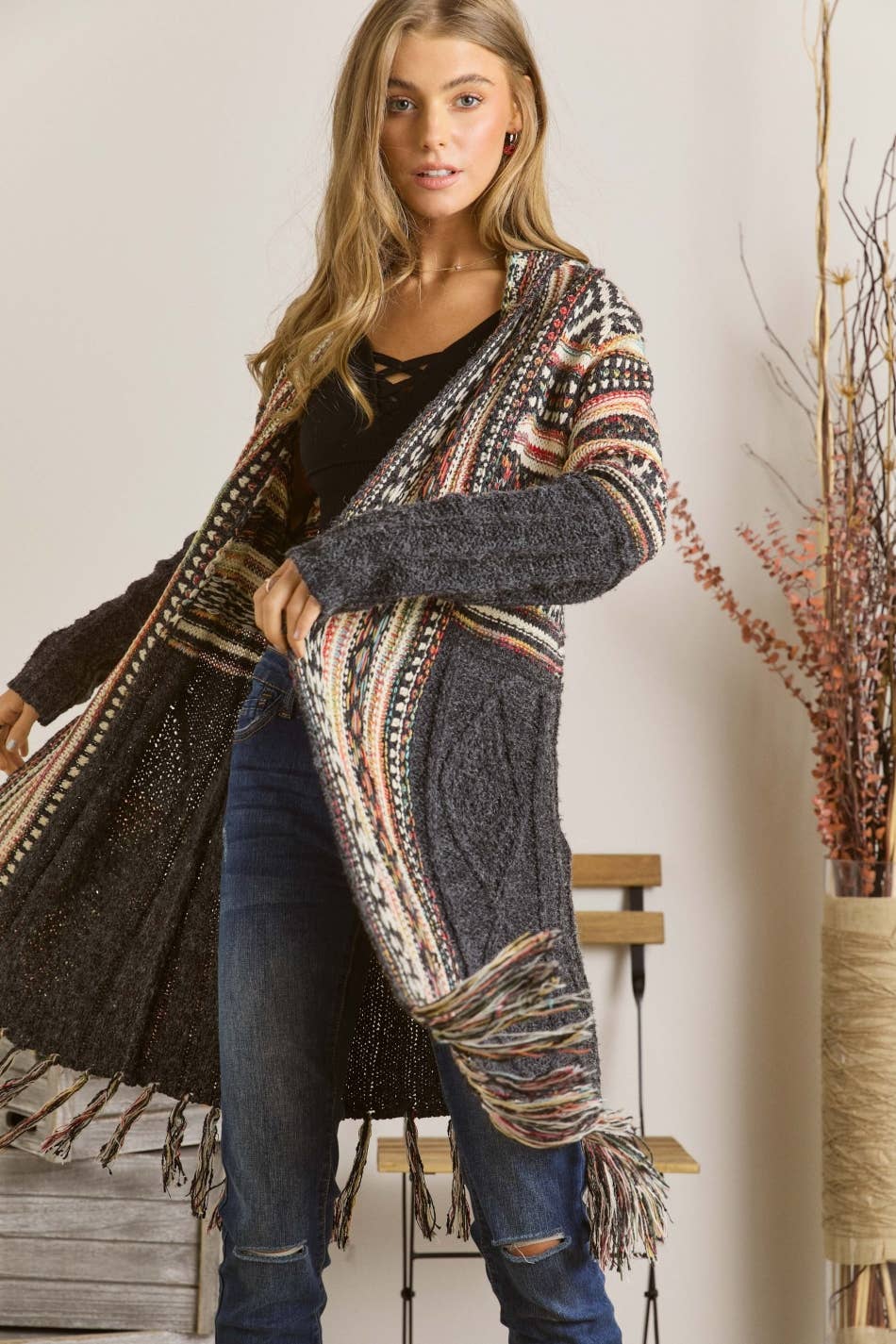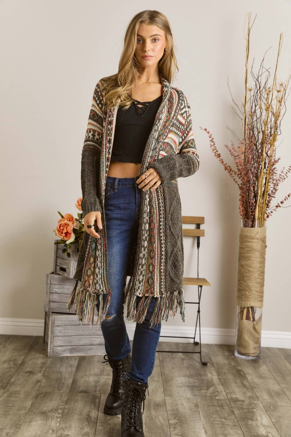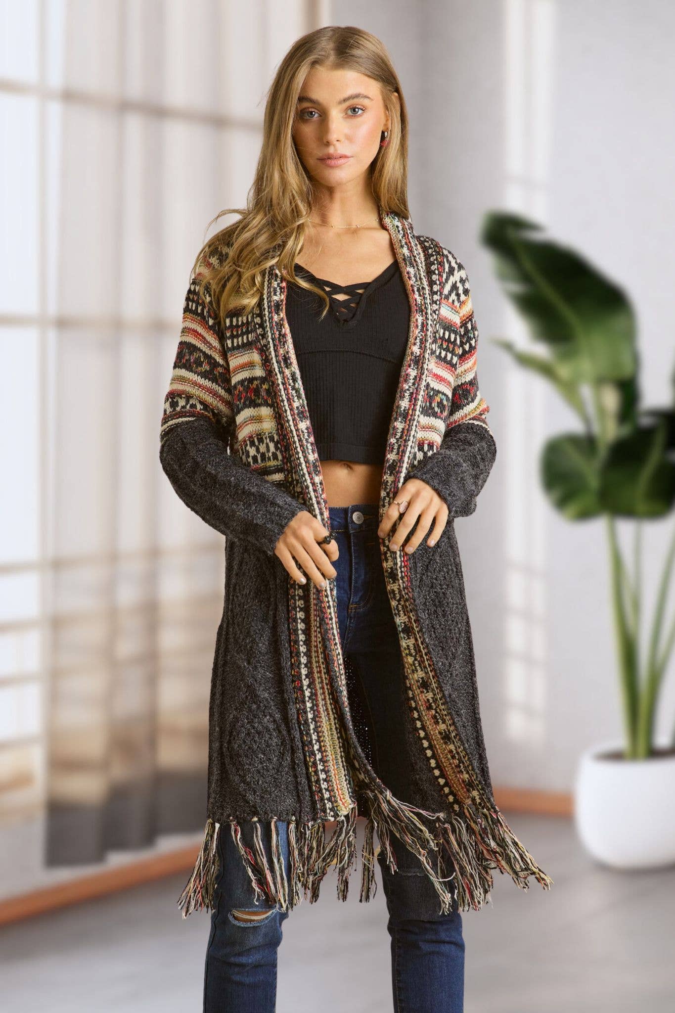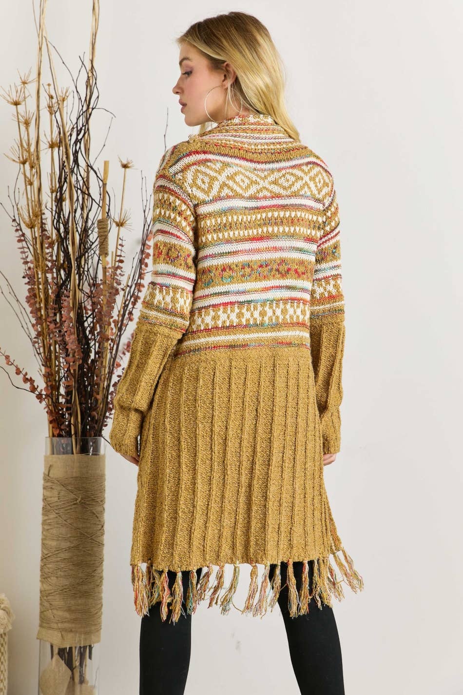 OPEN FRONT TRIBAL AZTEC FRINGE KIMONO SWEATER CARDIGAN 65% ACRYIC 35% POLYESTER. *Front drape *Tribal, Aztec pattern *Fringe hem *Warm, Daily, Casual wear Actual product color may vary from the images shown. Every monitor or mobile display has a different capability to display colors, and every individual may see these colors differently.