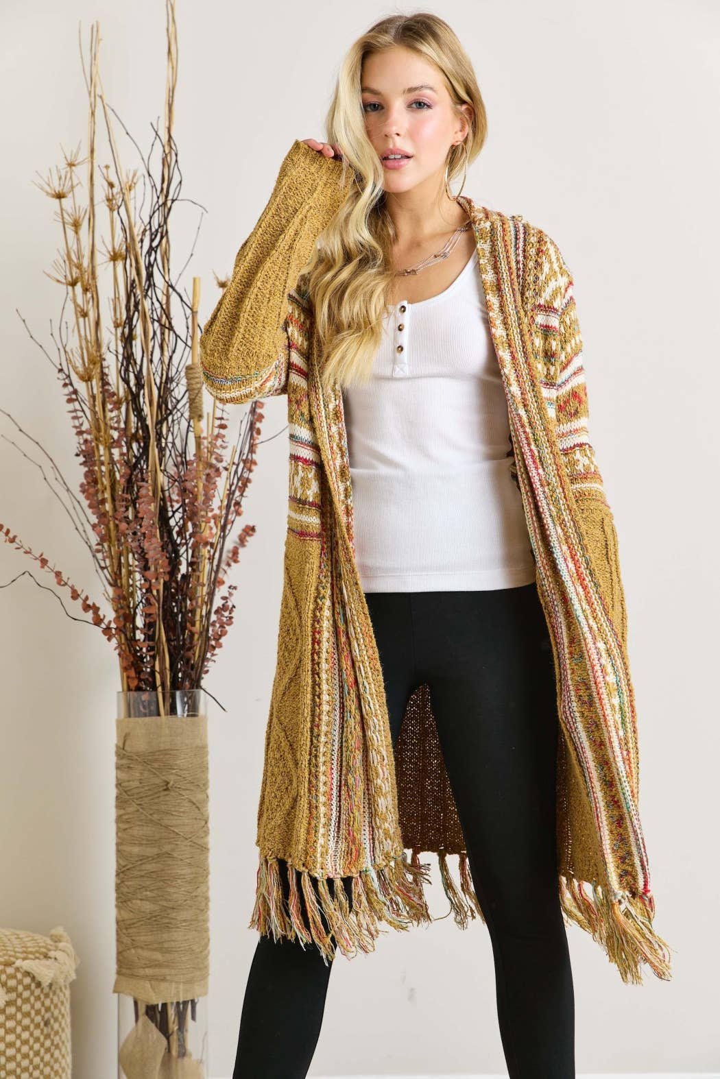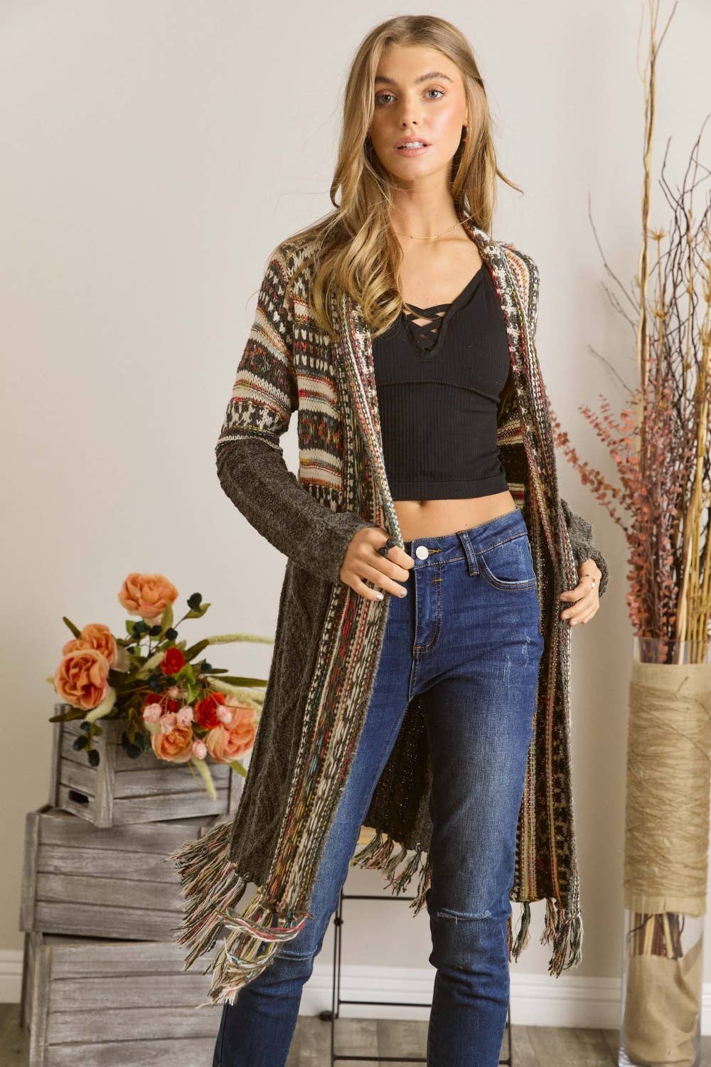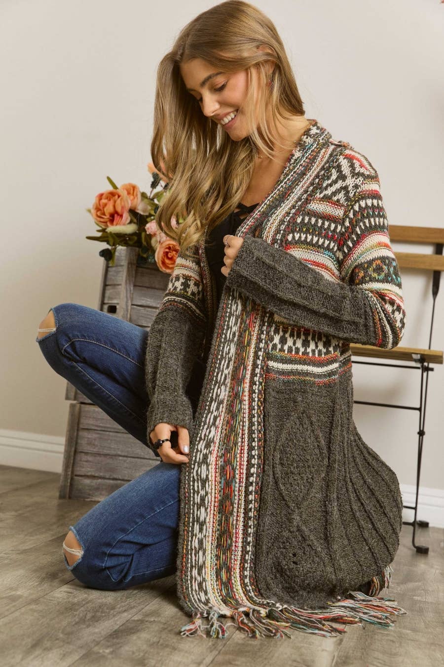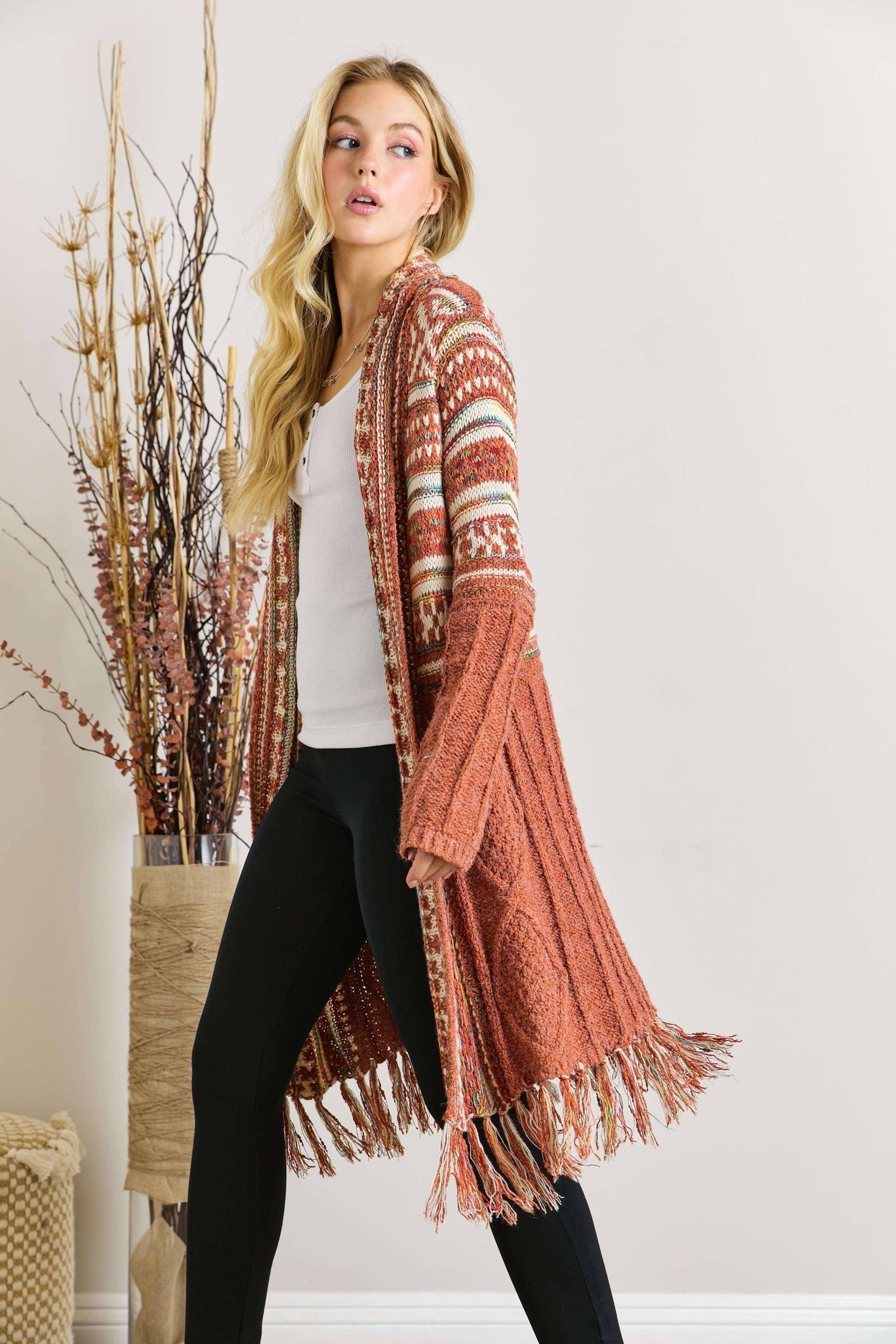 OPEN FRONT TRIBAL AZTEC FRINGE KIMONO SWEATER CARDIGAN 65% ACRYIC 35% POLYESTER. *Front drape *Tribal, Aztec pattern *Fringe hem *Warm, Daily, Casual wear Actual product color may vary from the images shown. Every monitor or mobile display has a different capability to display colors, and every individual may see these colors differently.
