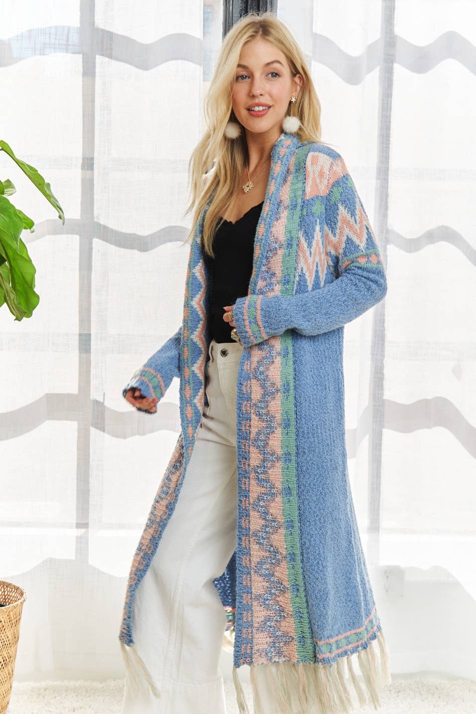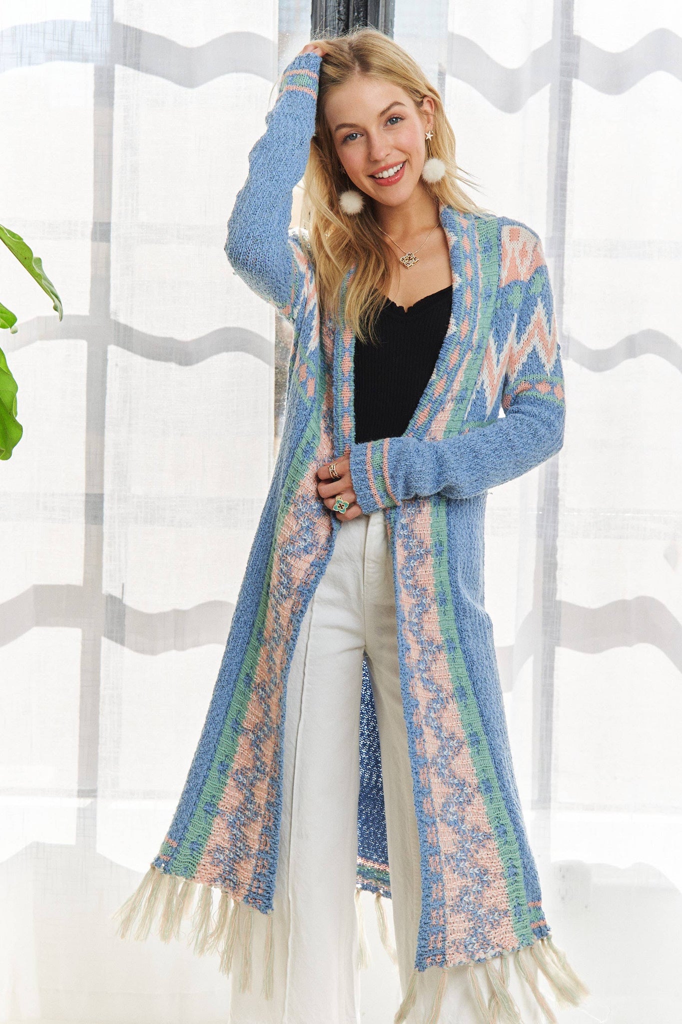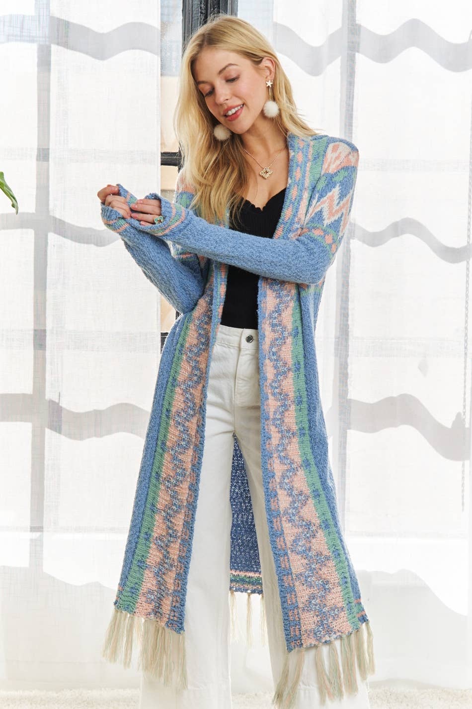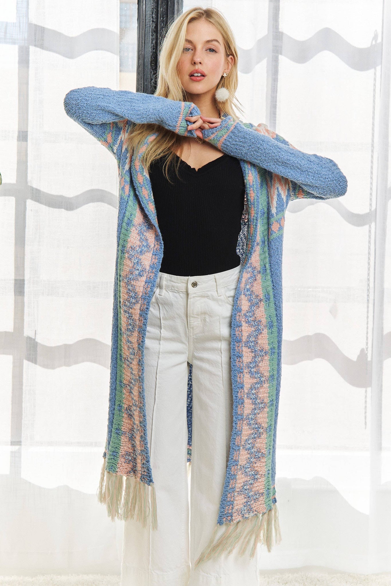 PASTEL TRIBAL PATTERNED CARDIGAN WITH TASSEL DETAILING. 65% ACRYLIC 35% POLYESTER *Front drape cardigan *Aztec, Tribal pattern *Fringe hem detail *Warm, Comfy, Daily wear Actual product color may vary from the images shown. Every monitor or mobile display has a different capability to display colors, and every individual may see these colors differently.