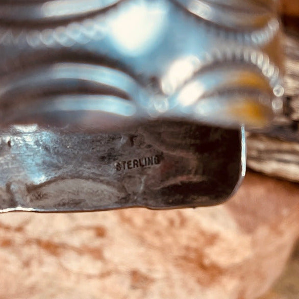 Authentic Old Pawn jewelry will have a natural gray patina, indicating age. It takes decades for the patina to develop and may appear grayer in dry climates like the southwest. Humidity will add a darker, blacker patina. Patina typically isn’t buffed off in order to preserve its history and value. Made of Sterling Silver.