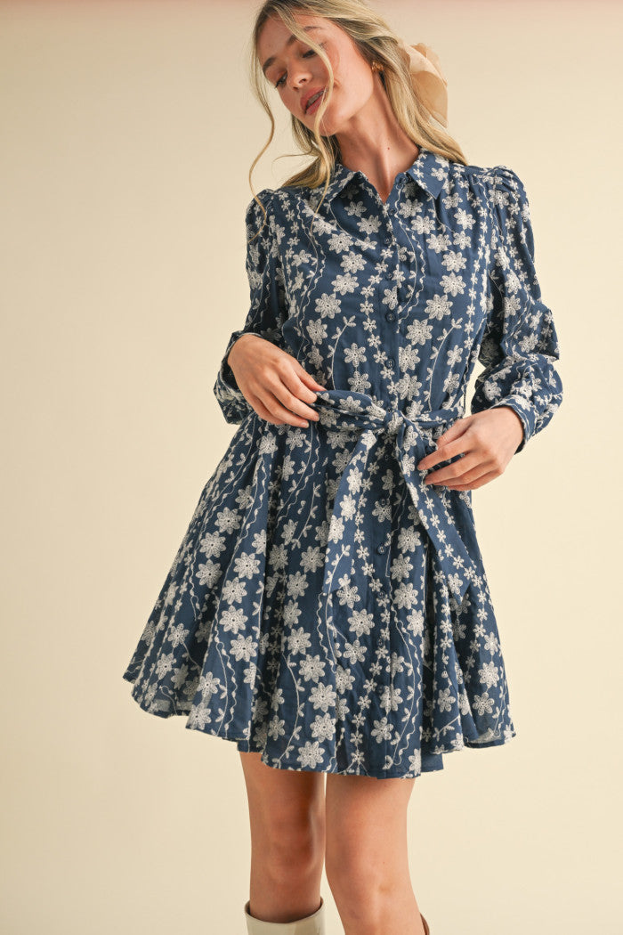 We’re dreaming of wearing this floral embroidered flare mini dress on repeat this season! Denim fabric, with a gorgeous floral embroidery throughout, sweeps from long puff sleeves into a collared neckline with button down placket. A tying sash belt accentuates the waist and ends at a flirty flared mini hem. Pair this easy-to-wear dress with your favorite shoes for an effortlessly dreamy ‘fit!