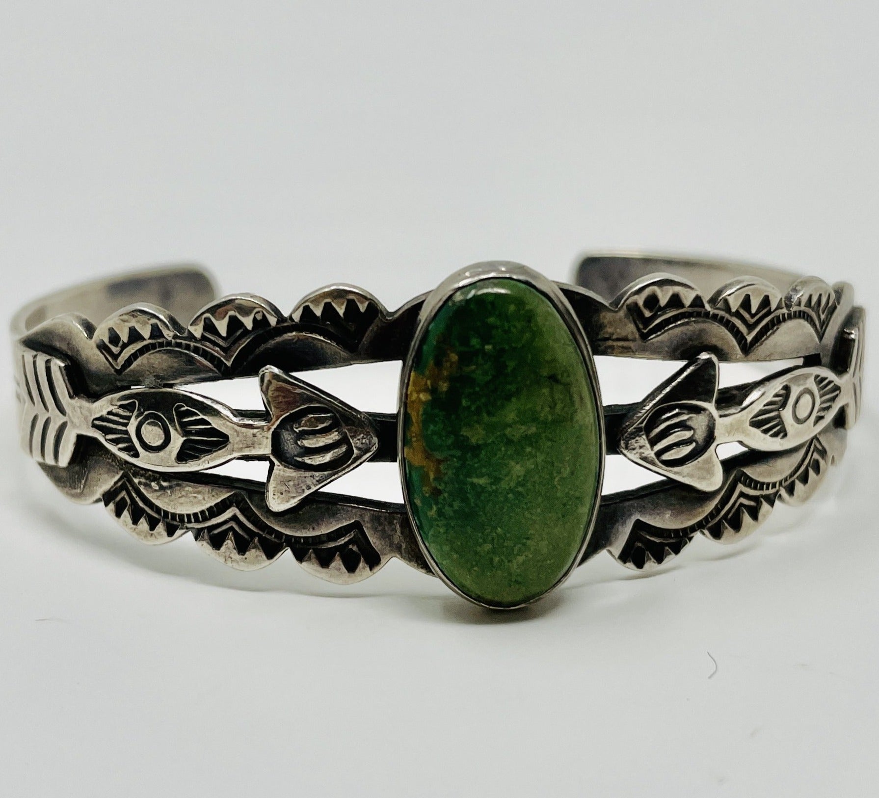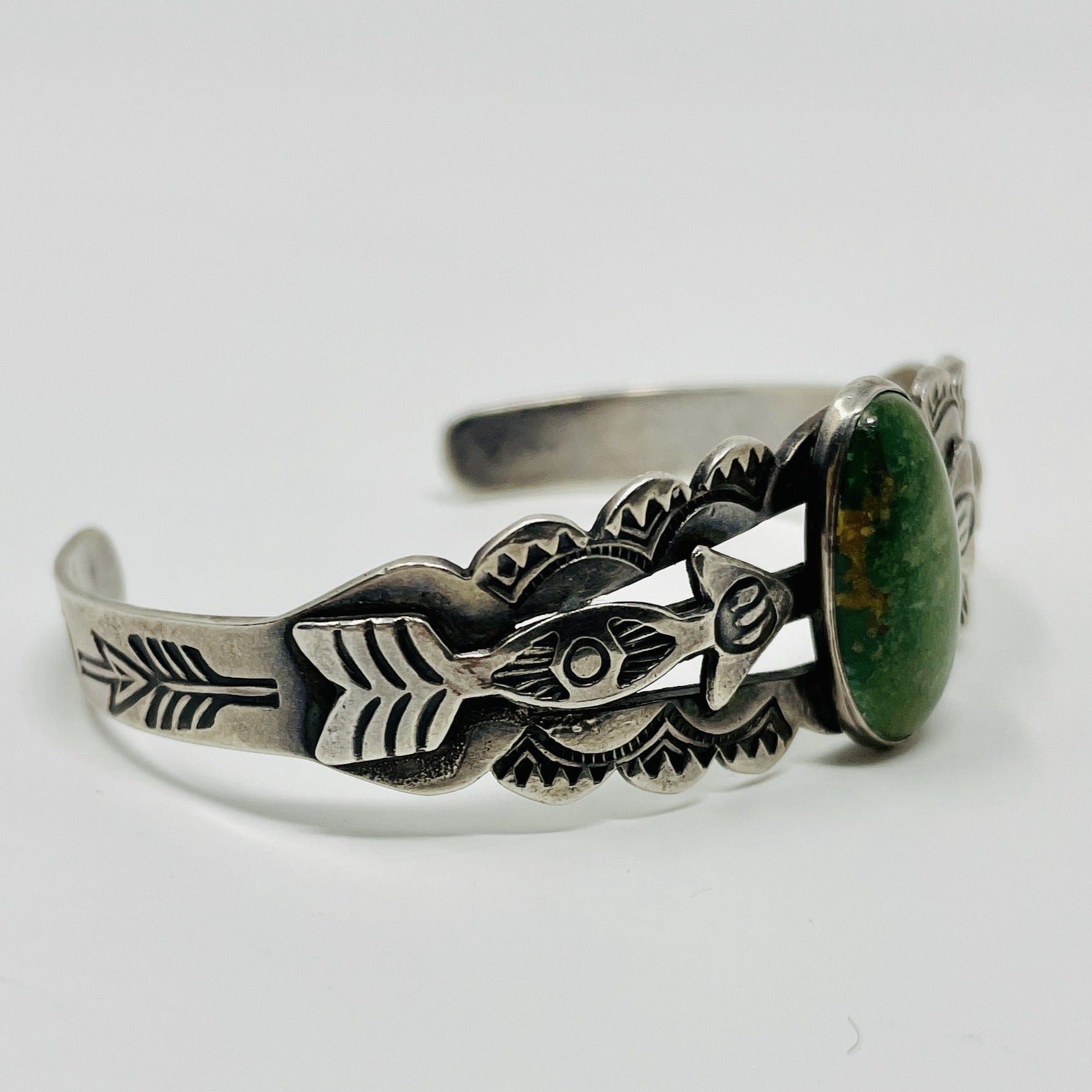 This Fred Harvey Cuff is a real beauty with a green turquoise cabochon set in a bezel surrounded by delicate swirls. Hand stamping and embellishments feature arrows and scalloped edges.