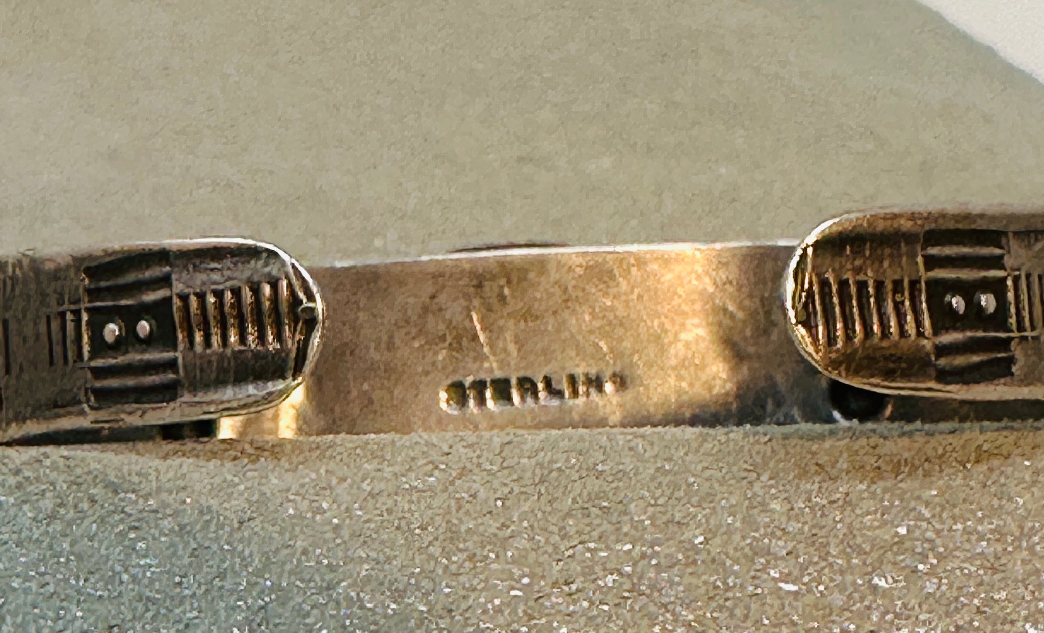 Fred Harvey Cuff with center oval green turquoise stone. . Appliquéd arrowheads on either side of the stone. Repousse snake eyes and southwestern hand stamped symbols.