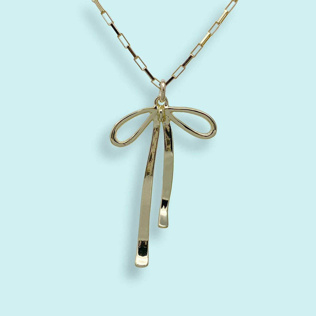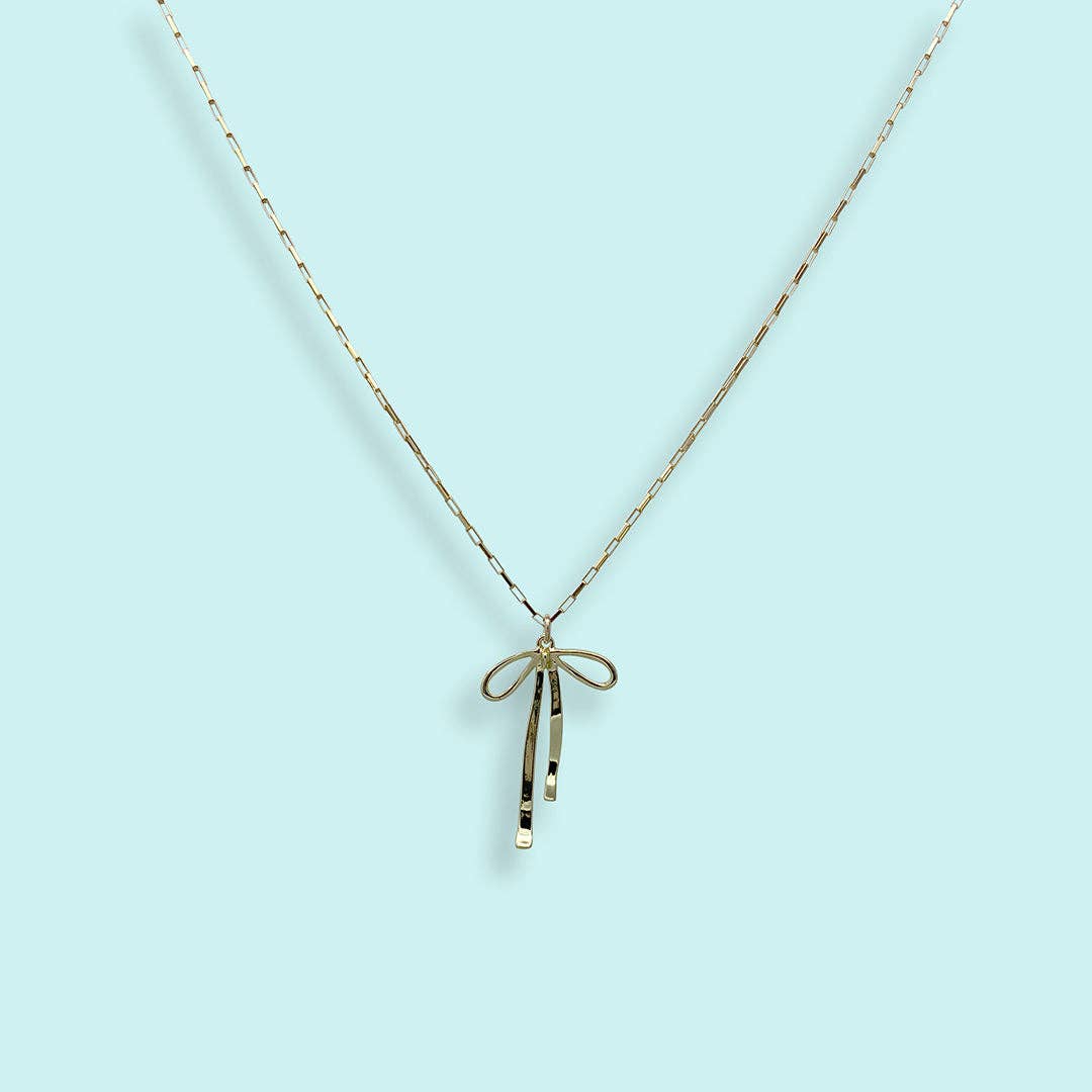 Ribbon bow on a gold box chain. * Metal: 14kt gold-filled pendant, 14kt gold-filled chain * Size: 1" long pendant * Lobster clasp * Available on 16", 18", or 20" chain (18" Fits Most) * Nickel Free