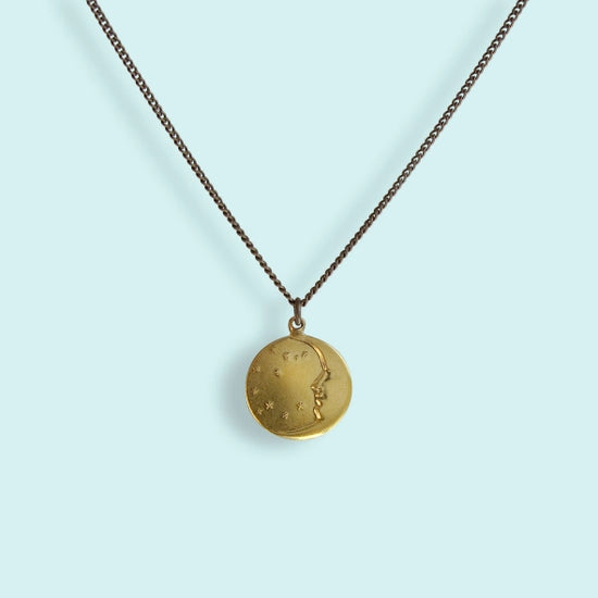 Man-in-the-moon and starry sky pendant on aged brass curb chain. Metal: 24kt gold plate over brass on pendant, aged brass chain Size: 1" W Pendant, 18" chain Lobster Clasp Made in the USA