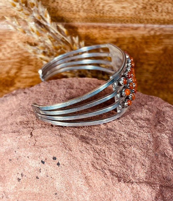 The Find Moab is pleased to bring you this marvelous southwestern Old Pawn Navajo snake eye coral silver bracelet. This piece contains three beautiful rows of phenomenal snake eye coral stones with a total of 24 remarkable stones. This bracelet has 4 silver shanks that are square shaped and lightly encircles your wrist. This wonderful piece was acquired from a private collector located in Missouri and would be a marvelous addition to your own private collection. For further information, please call 702-301-2252.