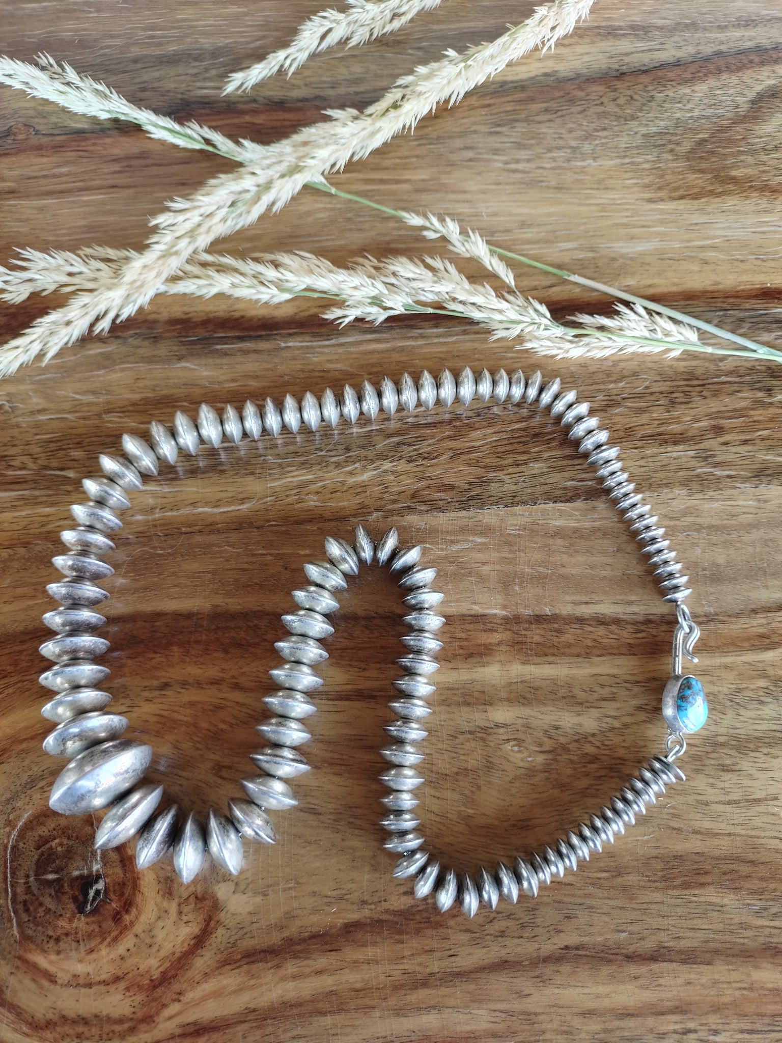 This handmade Navajo Pearls Bauble Necklace is hand-forged with an Old World Oxidized Finish and strung on a chain. Also features a 1/2" Turquoise Bead on the clasp.