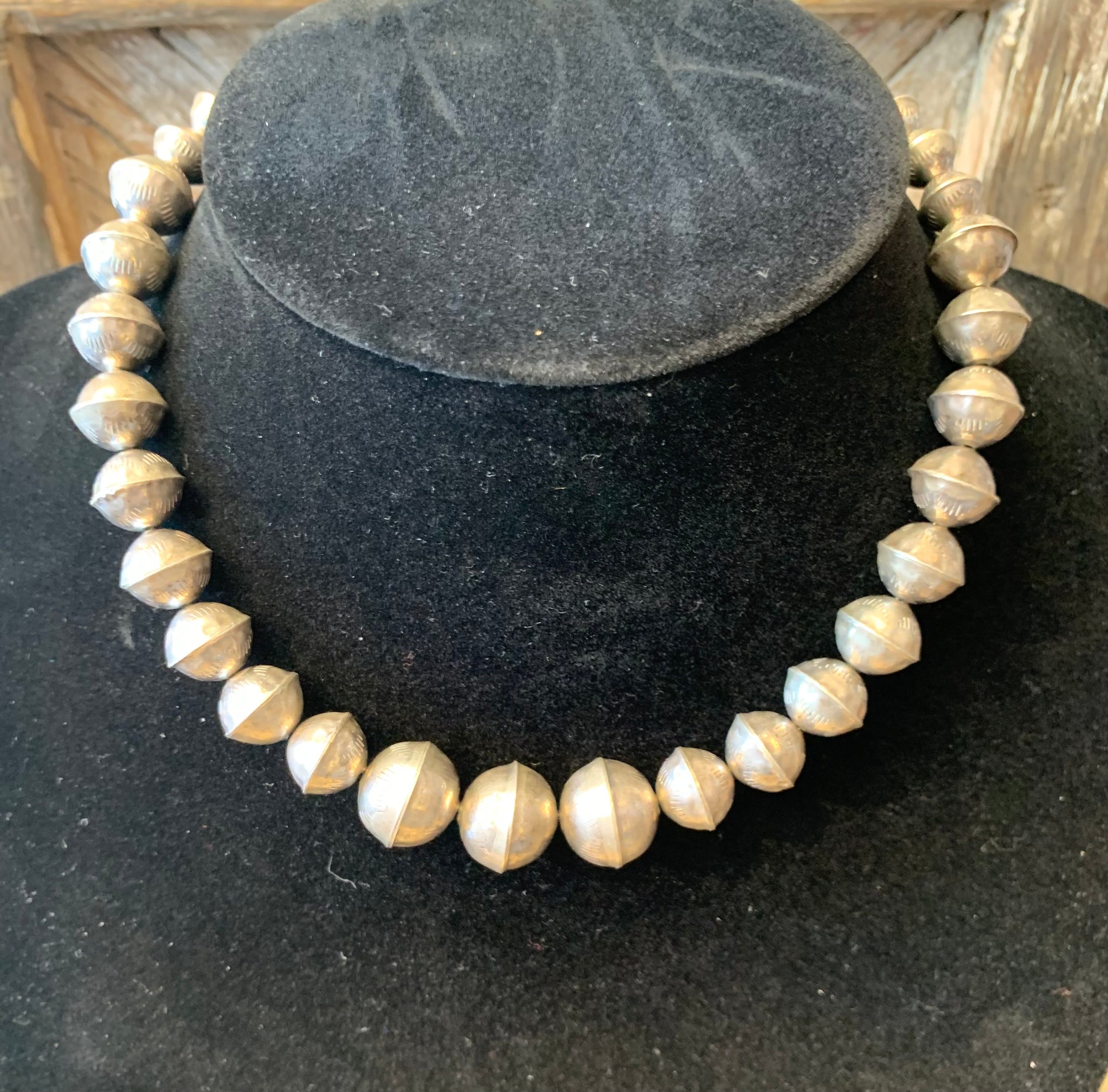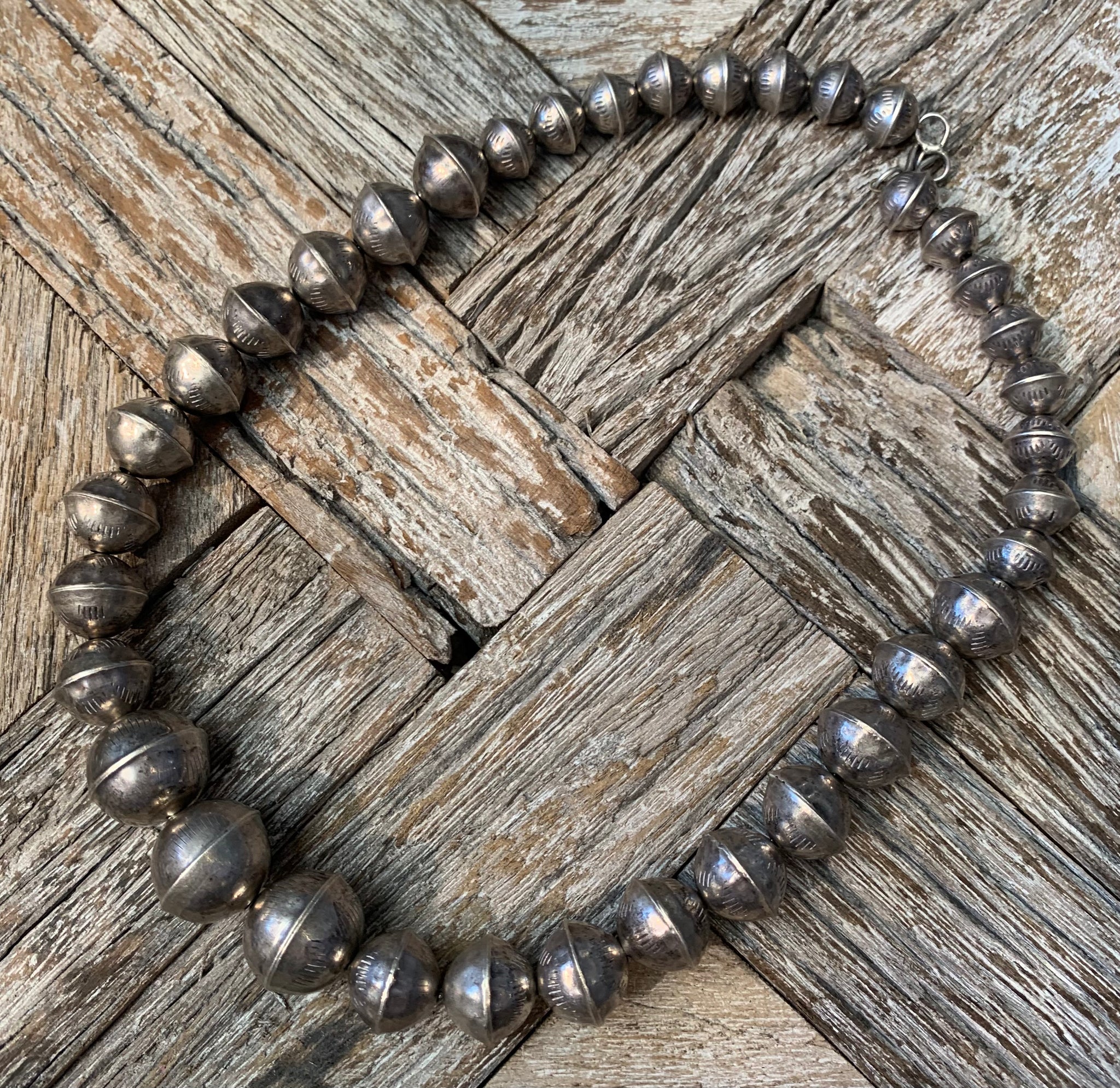 Authentic Old Pawn jewelry will have a natural gray patina, indicating age. It takes decades for the patina to develop and may appear grayer in dry climates like the southwest. Humidity will add a darker, blacker patina. Patina typically isn’t buffed off in order to preserve its history and value. Made of Sterling Silver