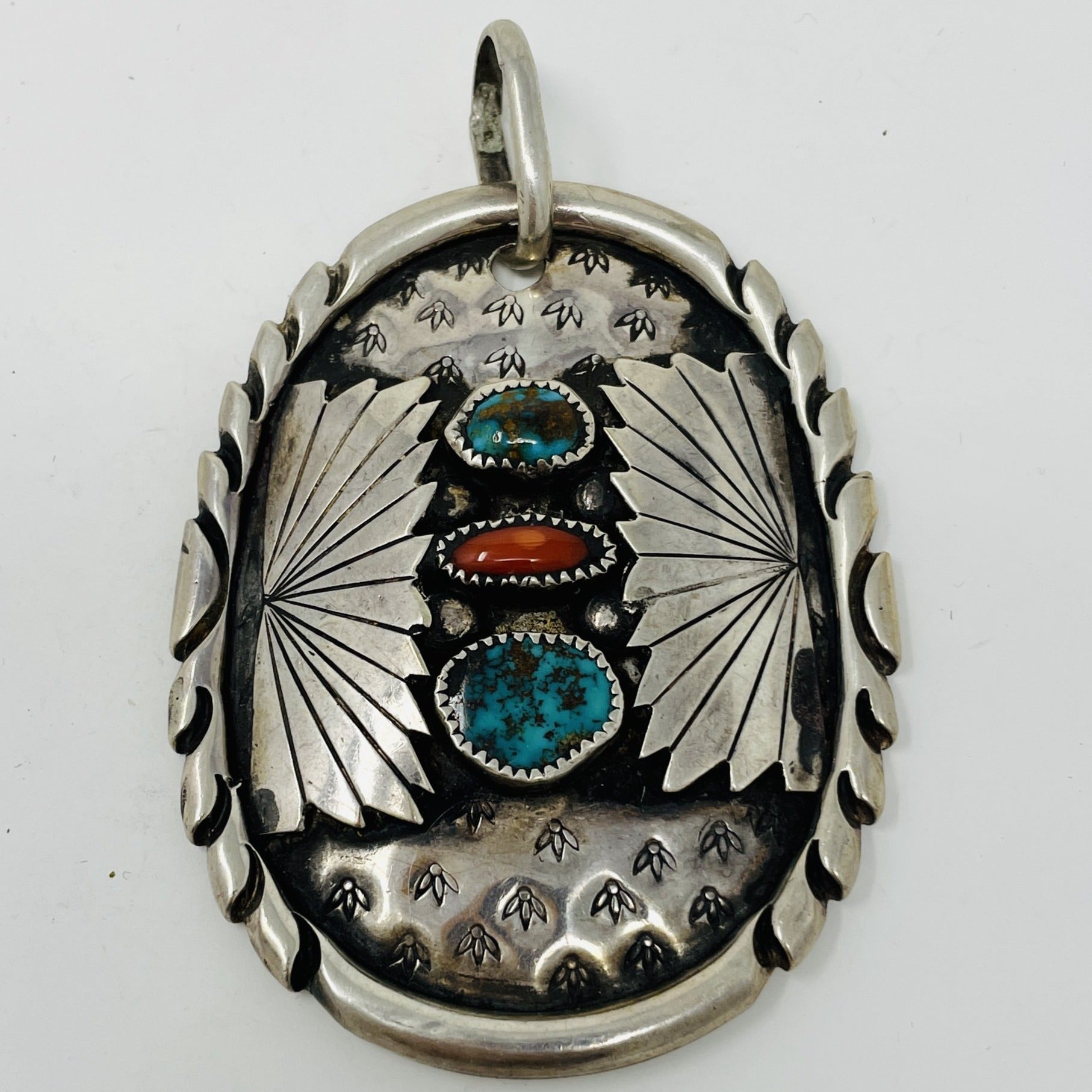 Navajo Pendant with 2 Turquoise and 1 Coral Cabochons