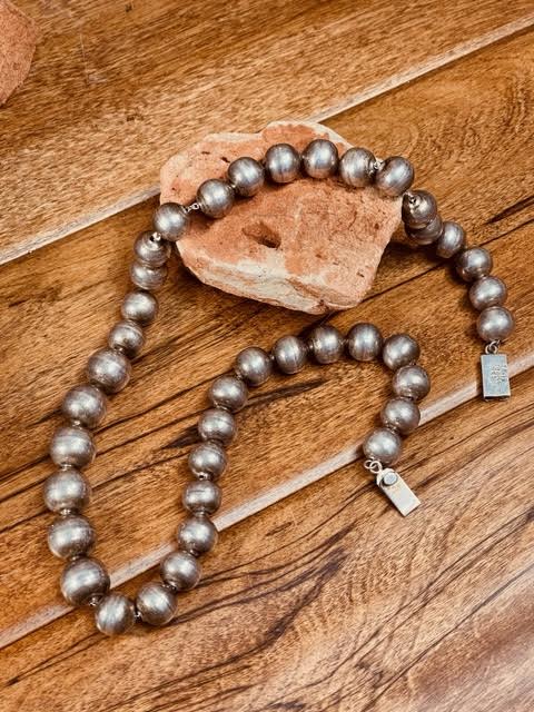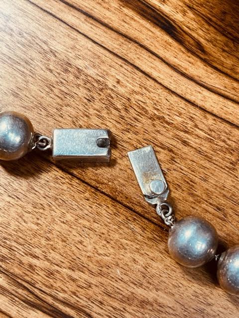 The Find Moab presents this gorgeous Mexico Pearl necklace. The patina on these handmade pearls is absolutely wonderful. The 1/2" beads are all the same size, and they are weighty. Bench beads are made by first rolling out and cutting sterling silver strips that are domed by hand into two spheres, which are soldered together then filed to smooth out the shape before drilling the holes for the beads. It is a labor intensive process, which comes through in the finish. Many beads show a seam yet these have been worked so well that while you can see where the two pieces came together, the seam has been smoothed through additional filing and work. The beads are strung onto a thick sterling silver link chain. This piece was acquired from a private collector in Missouri, and if there are any questions, please contact us at 702-301-2252.