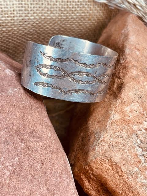 The Find Moab brings to you this stunning Vintage Old Pawn Native American Navajo Sterling Silver Hand Stamped Wide Cuff Bracelet featuring an intricate silver stamped design. This Old Southwest Indian cuff has such great patina and definitely has seen many ceremonial dances attended by the wearer. This amazing piece was acquired from a private collector in Missouri and if you have any questions, please call us at 702-301-2252.