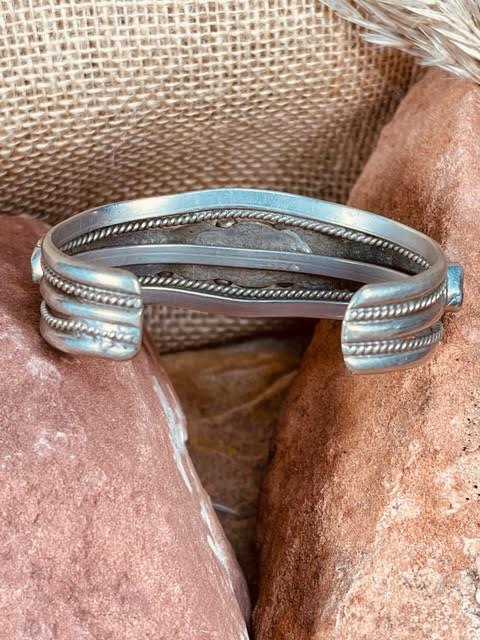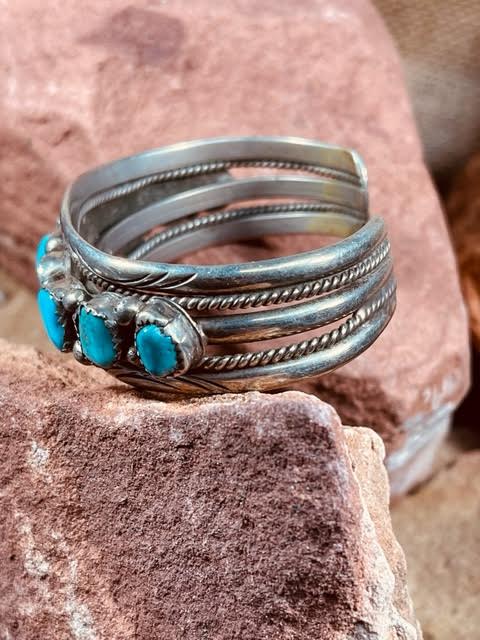 The Find Moab presents to you this amazing Hand designed cuff bracelet with simple traditional hand stamping style on the top edges of the cuff and the twisted rope that encircles your wrist is a great touch. Nine mounted turquoise stones are set securely in deep saw toothed bezels and separated by raindrops. The stones have amazing color, each stone is a different color of blue and green. This Old Pawn Indian cuff could be worn by man or woman. This piece was acquired in Missouri from a private collector. If you have interested in this piece, please call us at 702-301-2252.