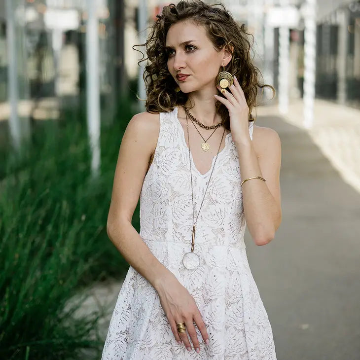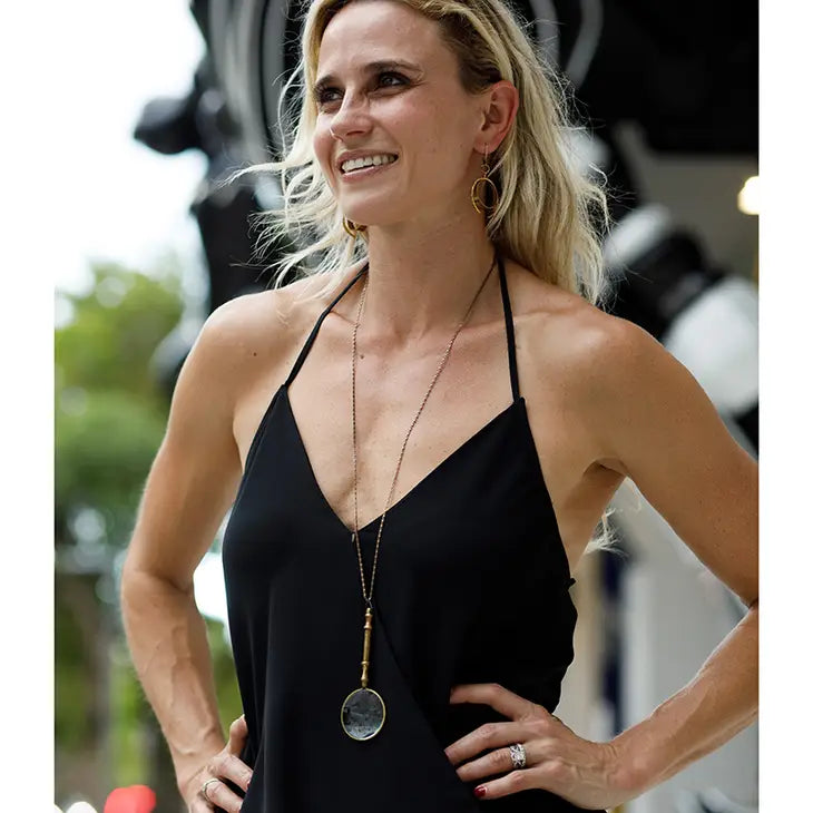 Magnifying glass with ornate handle on aged brass scroll chain. Metal: Aged Brass Size: 4" L Pendant, 32" Chain Lobster Clasp Materials: Working Magnifying Glass