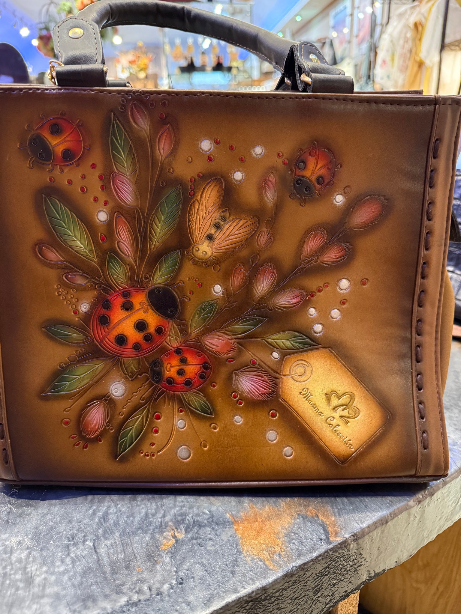Leather Hand-tooled details with a spacious interior, gold hardware and zip closure make this the ultimate statement tote. The tote includes a detachable Leather strap.