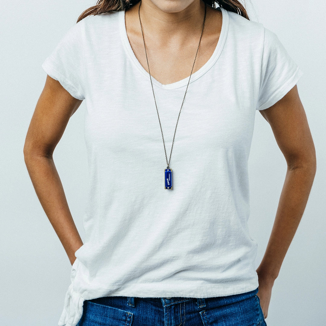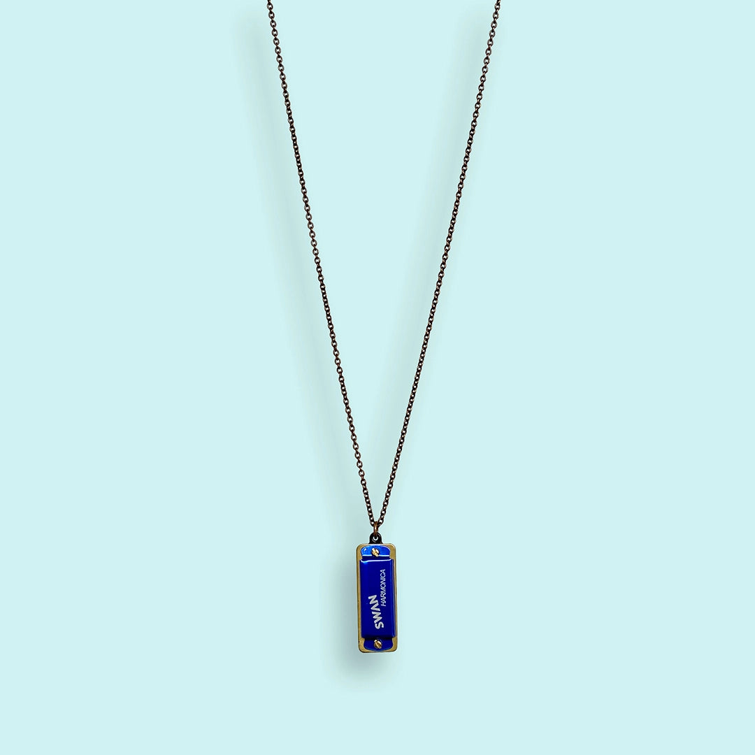 Small metallic harmonica on an aged brass cable chain. The harmonica works! Metal: base metal harmonica, aged brass chain SIze: 1.25" L harmonica, 32" chain Lobster clasp