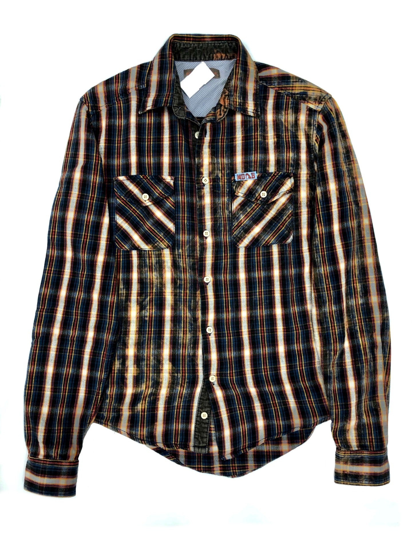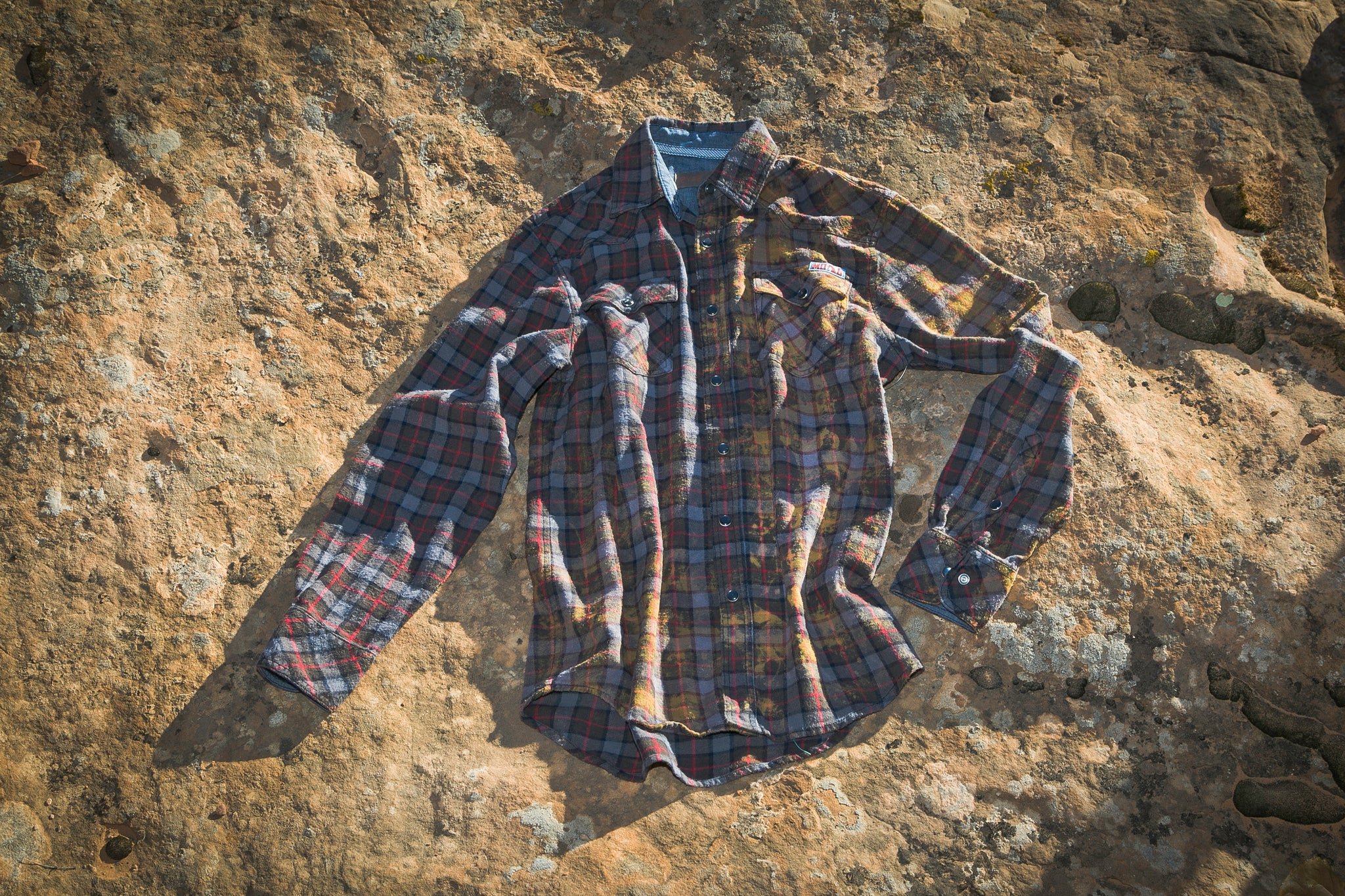 These shirts come from cities all over the U.S.- Las Vegas, Phoenix, Atlanta, Dallas, Detroit, Chicago. Each has become an entirely unique, one of a kind work of art through a proprietary technique. This exciting fabric comes in every imaginable blend of color, and the special technique used by Redtail’s designer adds remarkable color variations within each River Guide shirt. Artsy, sporty, anti-establishment, and yet classic. The outdoorsy quality of plaid enhanced by the effect of this design work calls for a special label, and River Guide fits the bill perfectly. In addition, each garment sports a special Moab label inspired by Redtail pilot Tim Martin, the Arch Enemy #1: a contrail left by a biplane flying through Delicate Arch creates the “A” in Moab.
