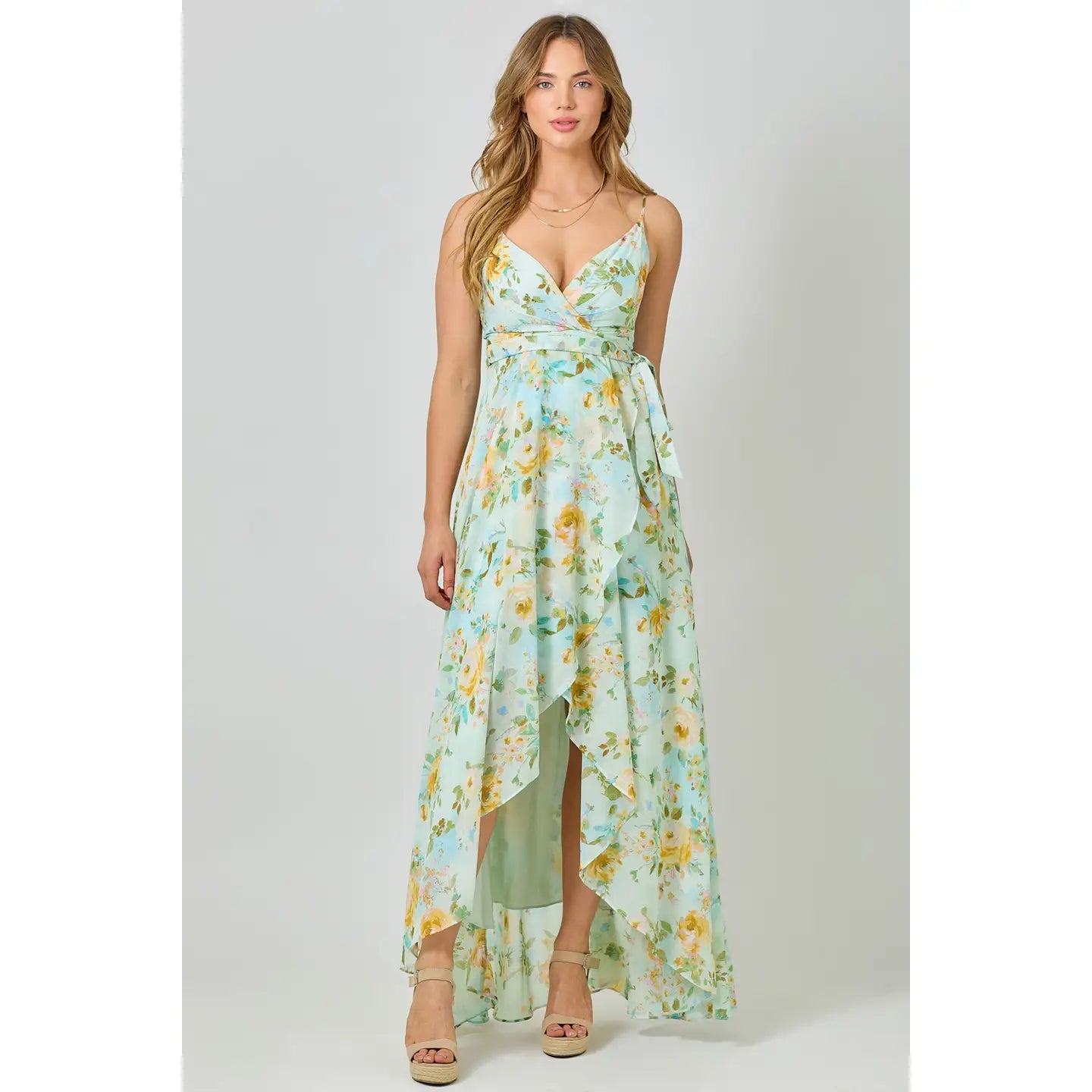 Ruffle Floral Chiffon Spliced Dress Adjustable straps Wrapped V-neck Waist belt Back zipper