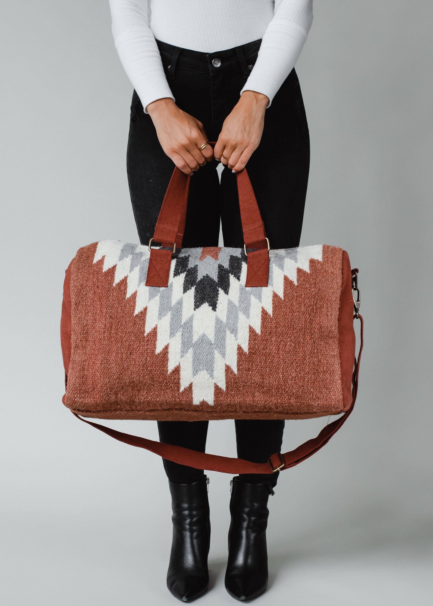Rust, cream & gray Aztec duffel Zipper closure with interior zipper and 2 small open pockets 19" x 9" x 11" 100% Cotton