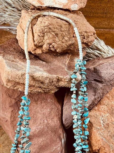 The Find Moab puts up this beautiful 1950s Santo Domingo Triple Strand turquoise nugget and heishi necklace with matching jaclas. The artist has polished turquoise nuggets with brown and dark brown matrix along with cut and polished heishi discs to create the two (2) piece necklace set. The artist has used a sequence of 2 to 4 discs between the nuggets finishing with a stack of graduating heishi discs up each side connected with a squaw wrap. The matching 4-1/2" jaclas consist of the graduating turquoise heishi beads with pieces of branch coral at each end. Both are strung on strong double twisted cotton cords. Just a stunning necklace and jaclas set! This gorgeous set was acquired from a private collector in Missouri and if you have any questions, please call 702-301-2252.
