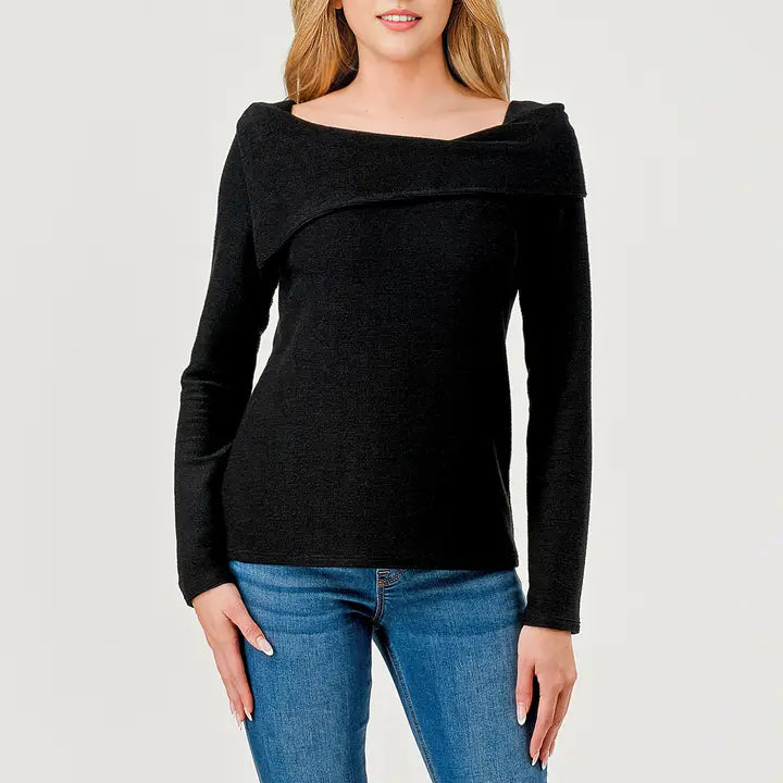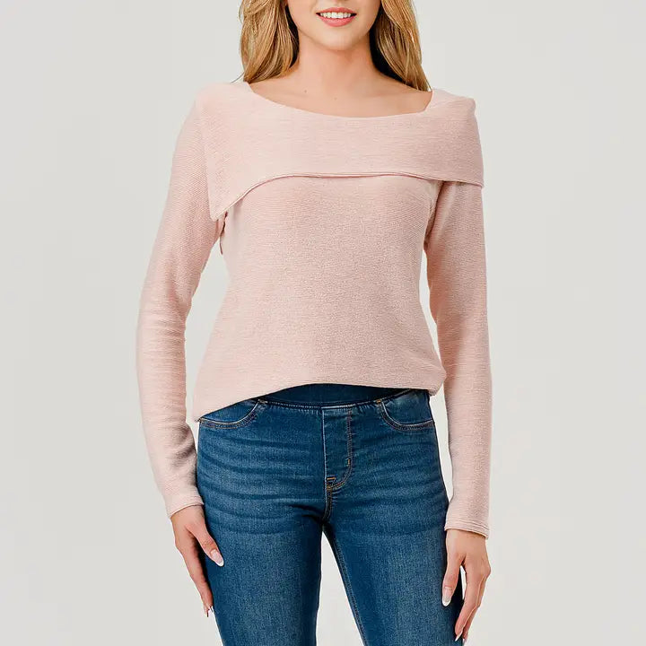 Off Shoulder Looking - Long Sleeve - Relaxed Fit - Soft - Rib Texture Machine Wash Cold Inside Out Gentle Cycle, Do Not Bleach, Tumble Dry Low. Fabric knitted in USA, Garments made in USA. 58% Poly 40% Rayon 2% Span