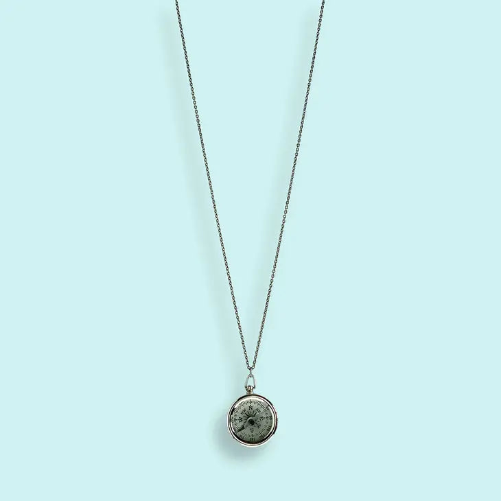 Small silver compass a long silver cable chain. Metal: Silver tone compass and chain Size: 1.25" W Compass, 32" Chain Lobster Clasp Materials: Working Compass