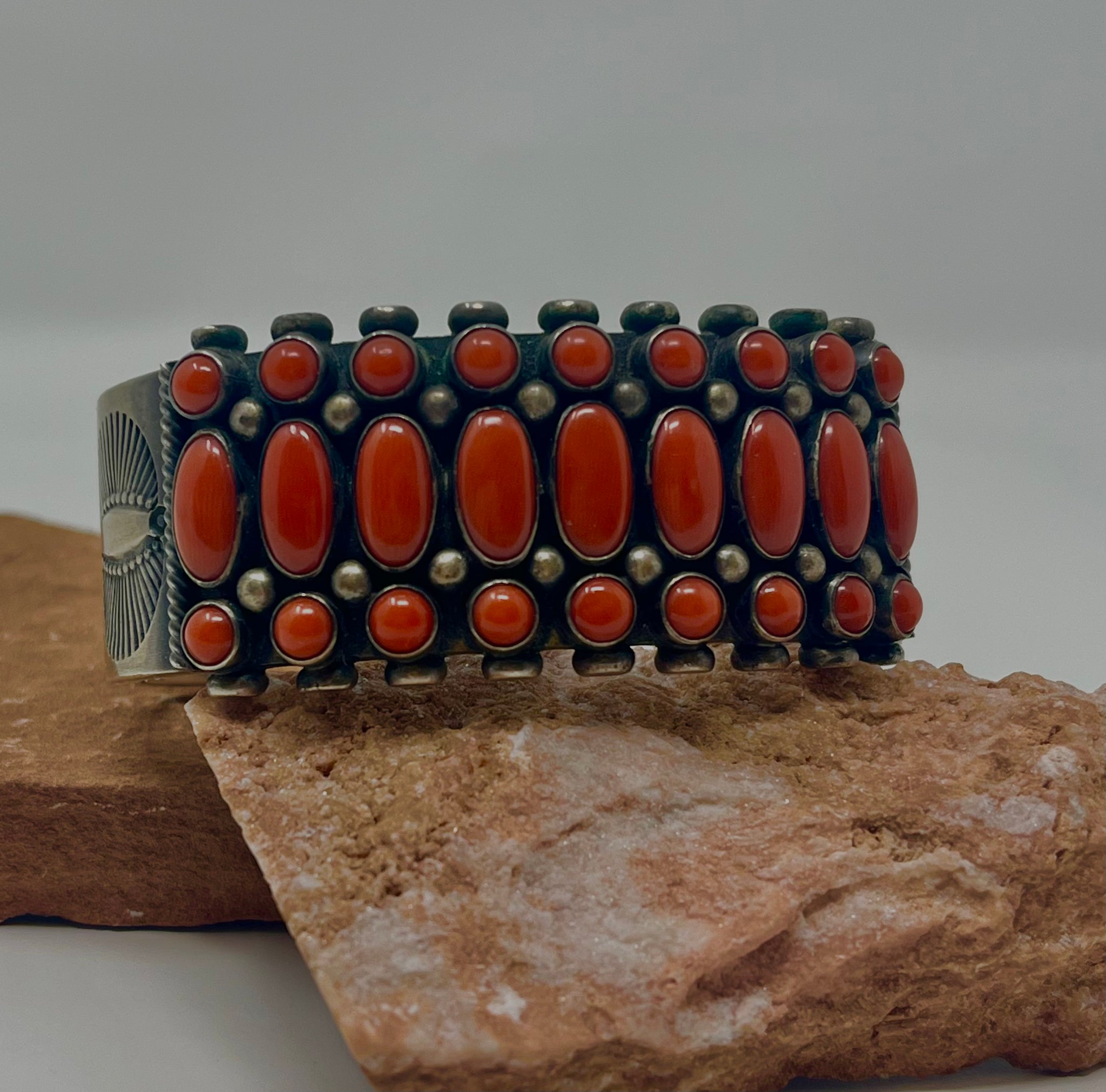 This Sterling cuff is an amazing example of Navajo craftsmanship. There are 27 Coral stones and raindrops with exquisite stamp work on the sides of the cuff. Would be amazing to wear alone or with stacking bracelets. This piece was acquired from a private collector in Missouri.