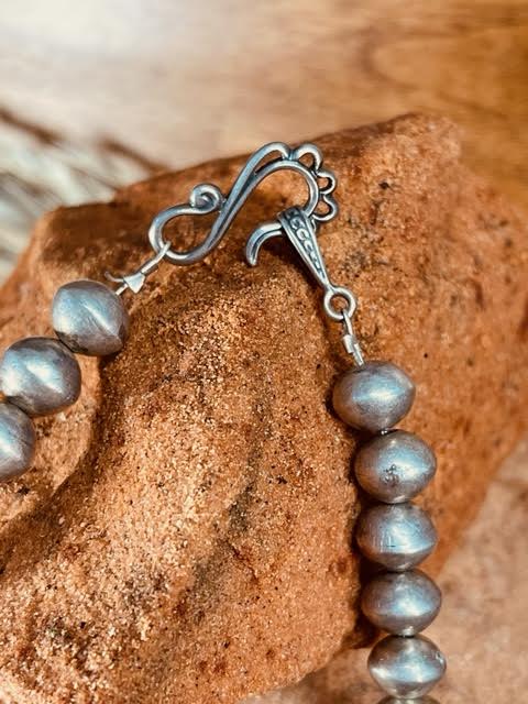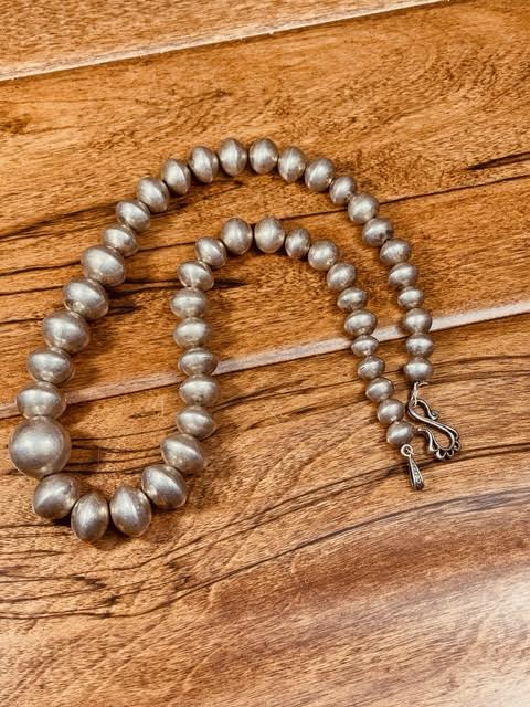 The Find Moab brings to you this beautiful and unique Old Pawn Sterling Silver American Indian Navajo Pearls necklace. The Navajo Pearl beads measure 1/2" in diameter graduating to 1/4" and have no hand stamping on them. The necklace has a gorgeous hook and eye closure (see 4th Pic). This unique necklace was acquired from a private collector in Missouri and if you have any questions, please call 702-301-2252.