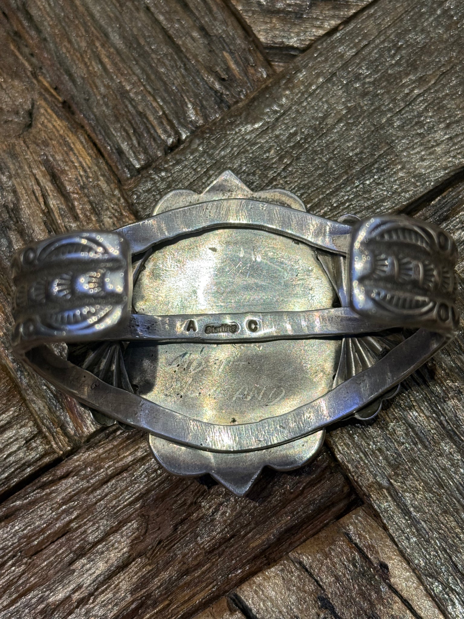 Authentic Old Pawn jewelry will have a natural gray patina, indicating age. It takes decades for the patina to develop and may appear grayer in dry climates like the southwest. Humidity will add a darker, blacker patina. Patina typically isn’t buffed off in order to preserve its history and value. Made of Sterling Silver