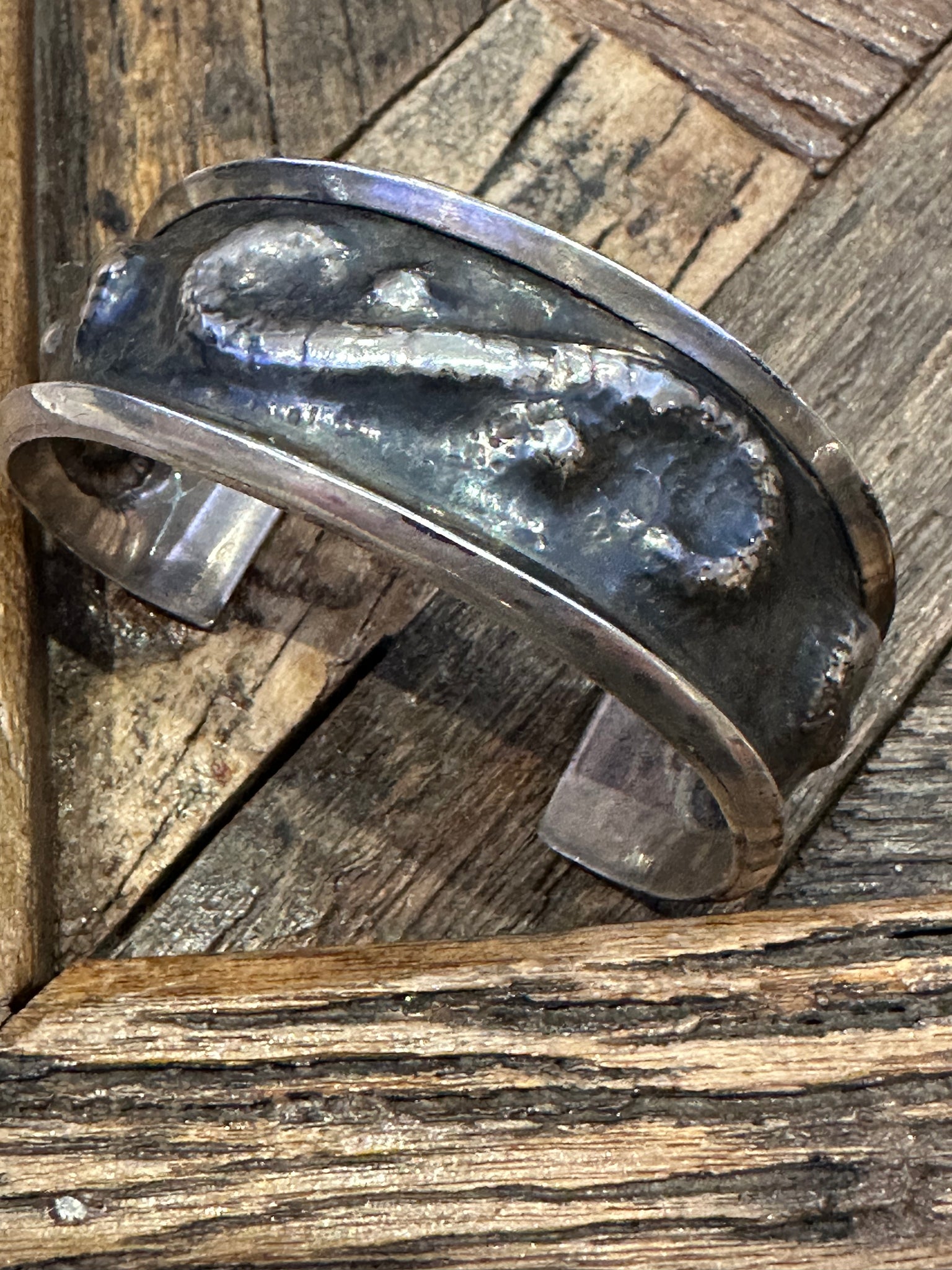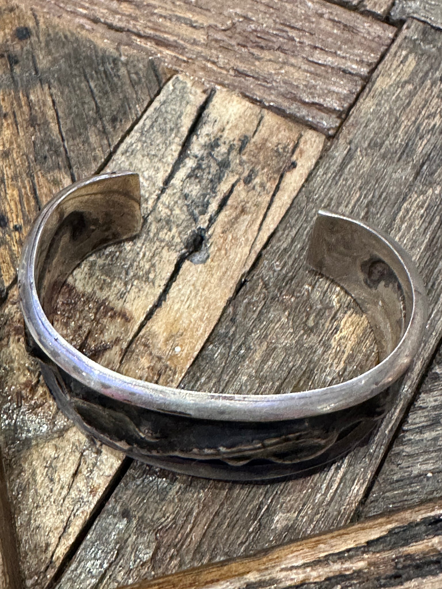 Authentic Old Pawn jewelry will have a natural gray patina, indicating age. It takes decades for the patina to develop and may appear grayer in dry climates like the southwest. Humidity will add a darker, blacker patina. Patina typically isn’t buffed off in order to preserve its history and value. Made of Sterling Silver