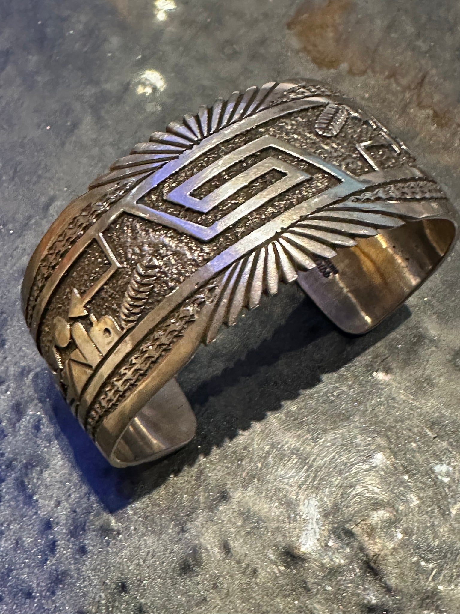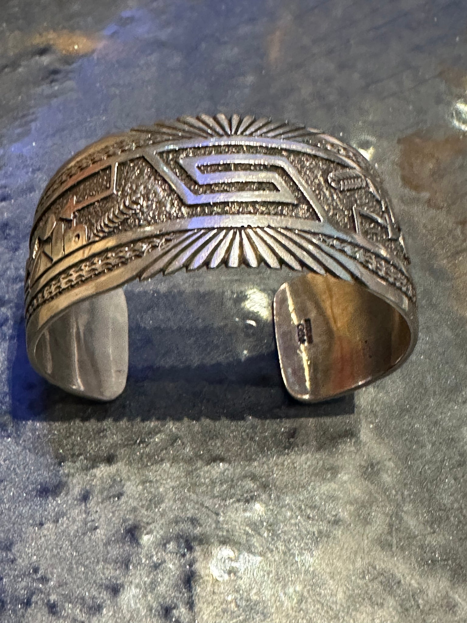 Authentic Old Pawn jewelry will have a natural gray patina, indicating age. It takes decades for the patina to develop and may appear grayer in dry climates like the southwest. Humidity will add a darker, blacker patina. Patina typically isn’t buffed off in order to preserve its history and value. Made of Sterling Silver