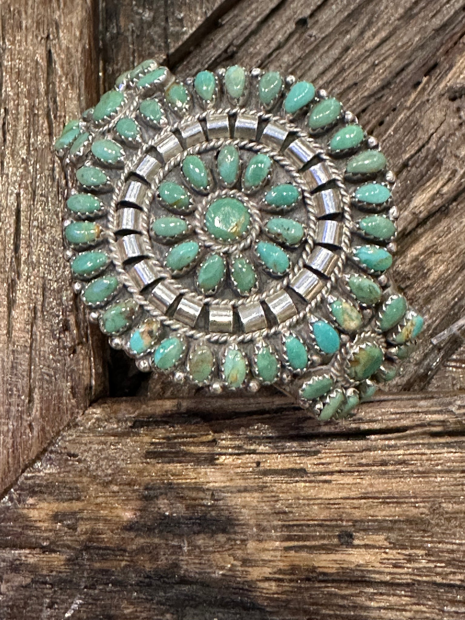 Authentic Old Pawn jewelry will have a natural gray patina, indicating age. It takes decades for the patina to develop and may appear grayer in dry climates like the southwest. Humidity will add a darker, blacker patina. Patina typically isn’t buffed off in order to preserve its history and value. Made of Sterling Silver