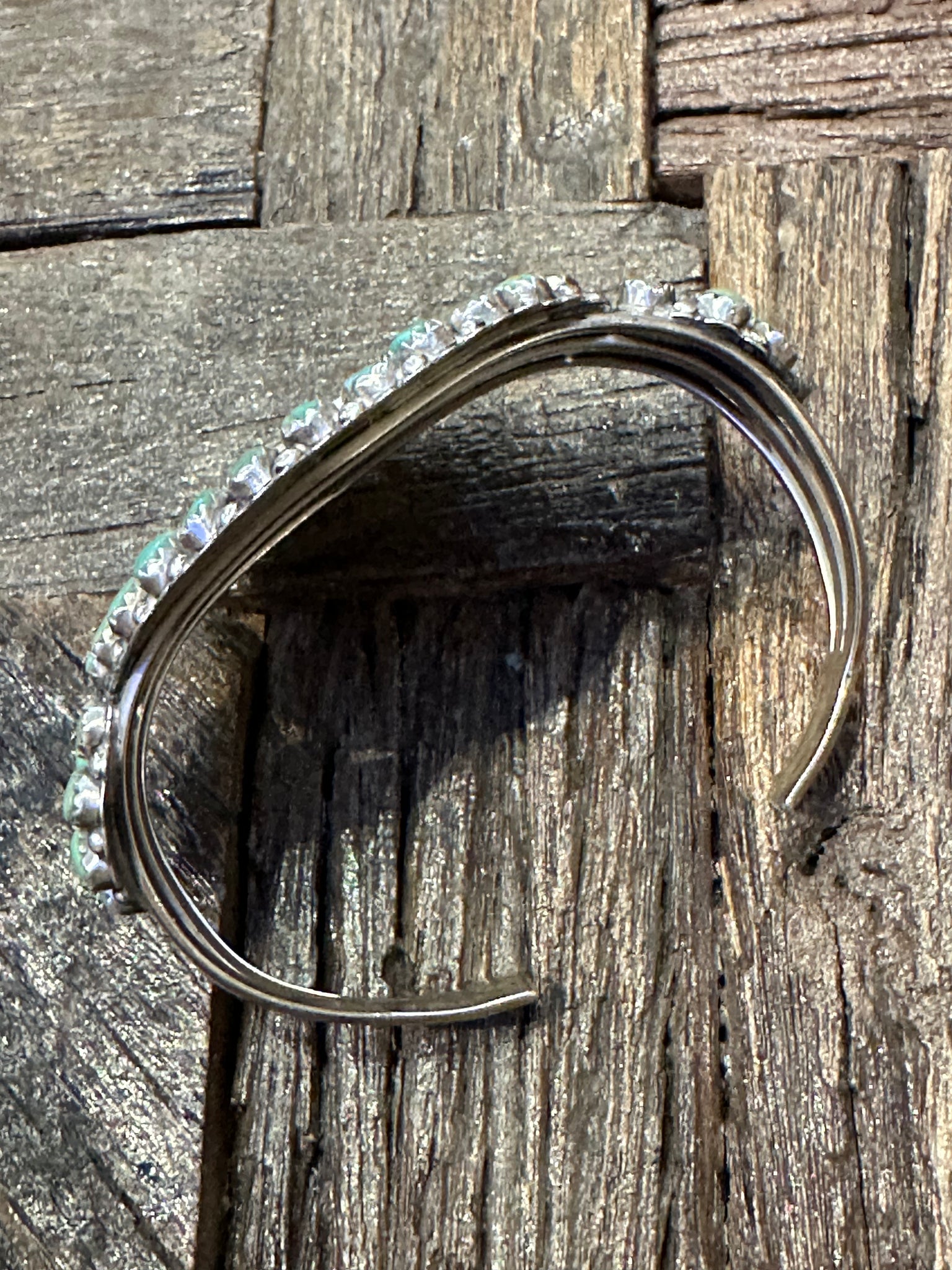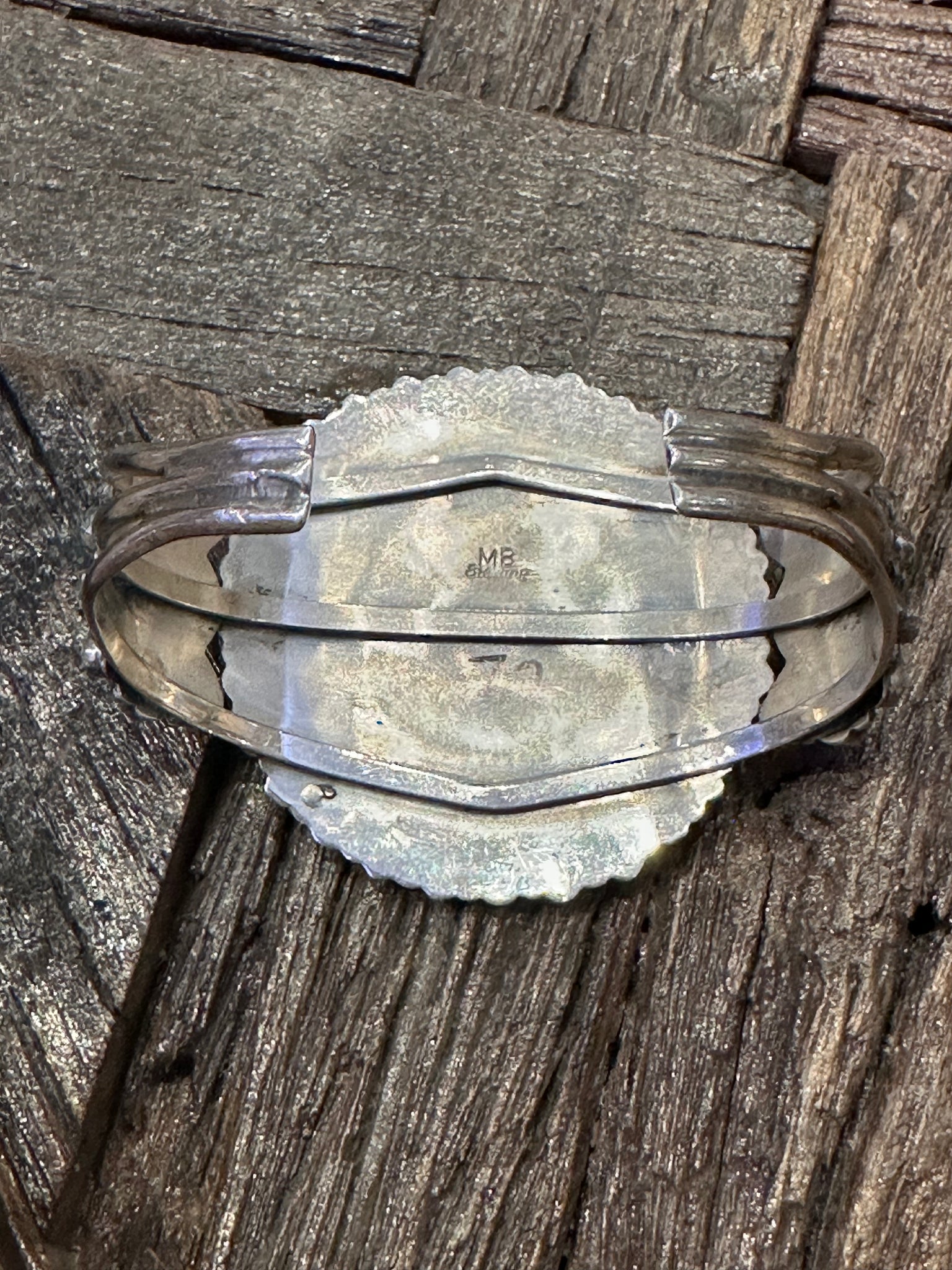 The cuff is signed "MB Sterling" and shows a triple split sterling silver cuff. This cuff features one round center stone with two round stones on each side all surrounded with classic petit point Royston turquoise stones.