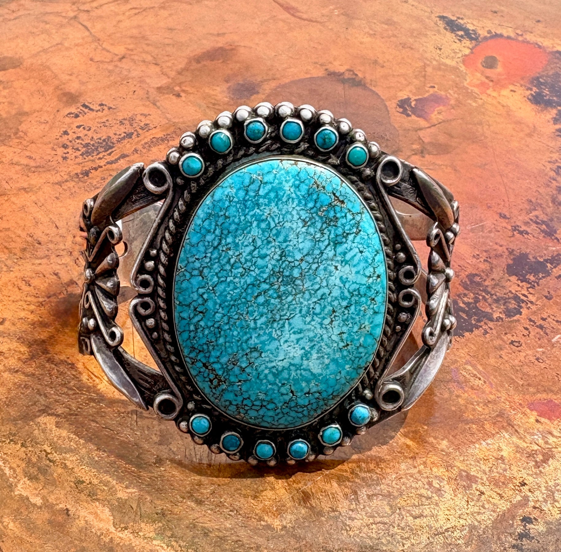 This striking vintage cuff features a large, oval turquoise cabochon with a beautiful light blue tone and fine spiderweb matrix, giving the stone a soft, cloud-like depth. Surrounding the center stone is a halo of smaller round turquoise accents, creating a classic cluster design that adds color and dimension.