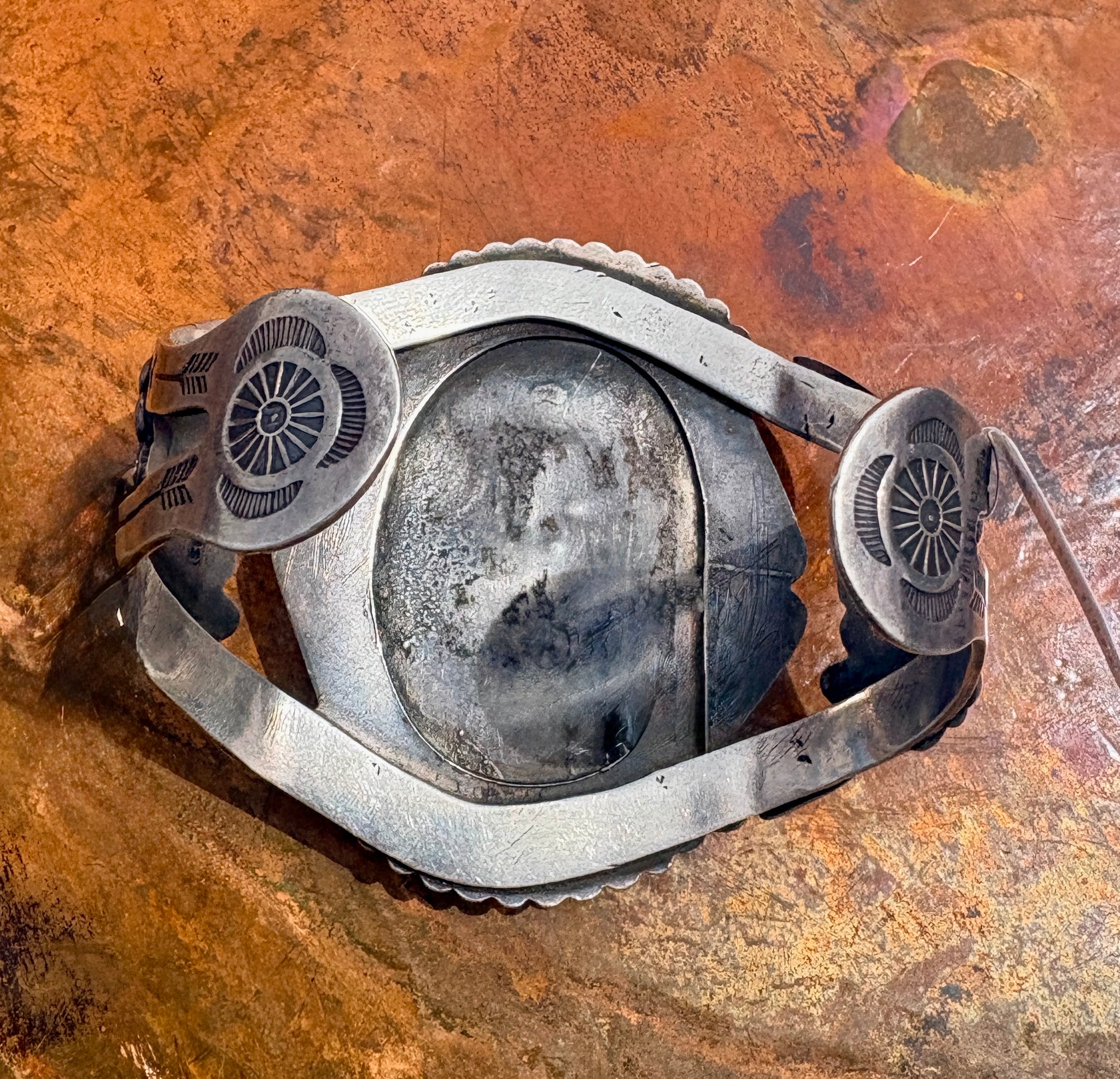 The stonework is framed with twisted rope detailing and bead accents, while the cuff’s sides are adorned with hand-stamped and appliqué silverwork, including fan and scroll motifs. The split shank design is finished with stamped rosette elements on the reverse, showcasing thoughtful craftsmanship from every angle.