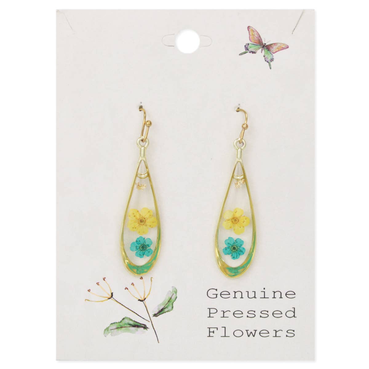 Add a touch of elegant cottage fashion to your look with our gold elongated teardrop earrings adorned with yellow dried flowers. These unique pieces blend nature with fashion, creating a stunning statement accessory that’s as beautiful as it is versatile. • • Genuine yellow dried flower earrings • Vintage inspired teardrop flower earrings • Materials: Gold Tone Metal, Acrylic, Genuine Dried Flowers • Measurements: 1 7/8 x 1/2"