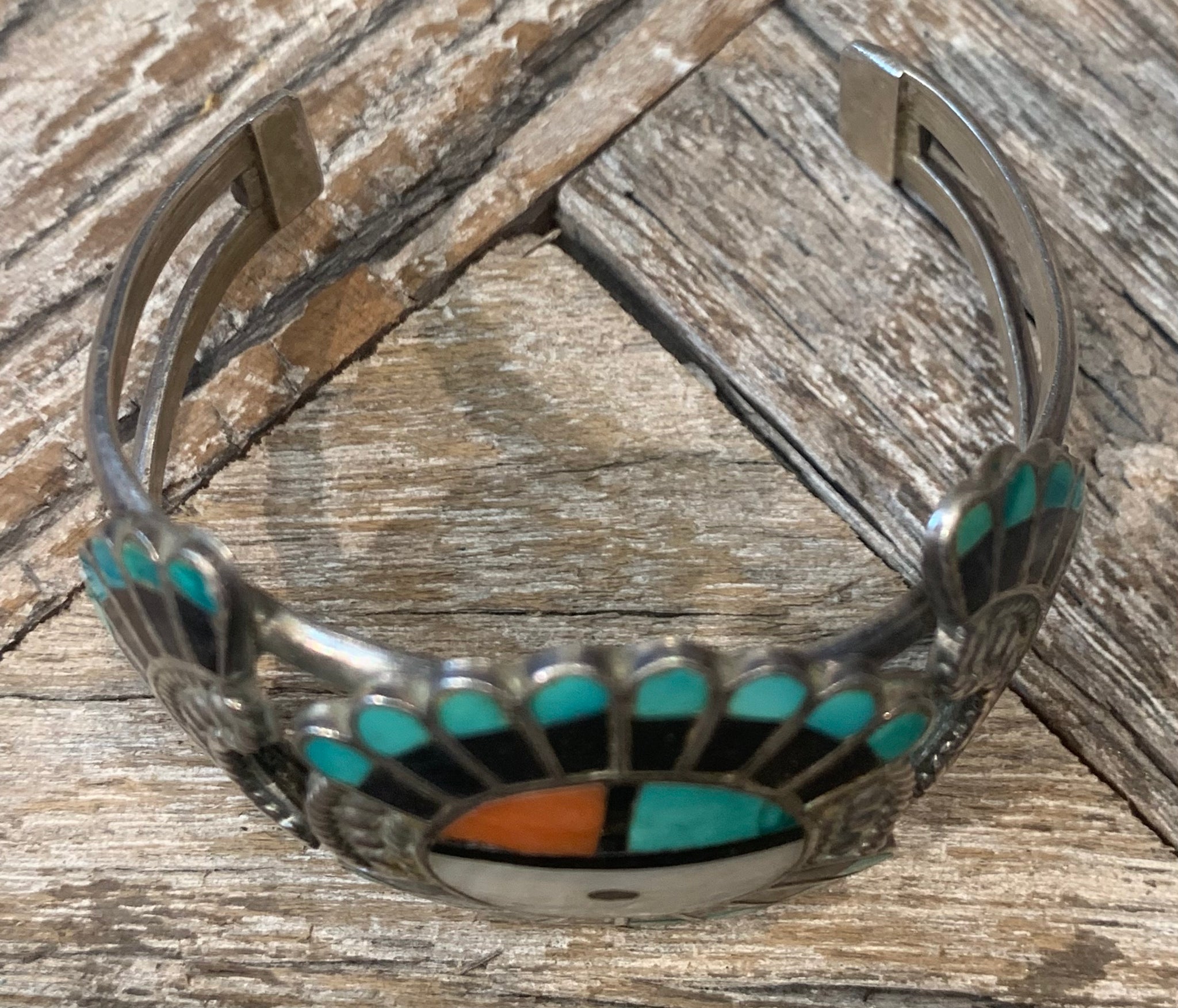 Old Pawn vintage Native American Zuni Sunface Sterling Silver cuff bracelet with natural Turquoise and red Coral and Mother-of-Pearl stones. circa 1960's; Unsigned.
